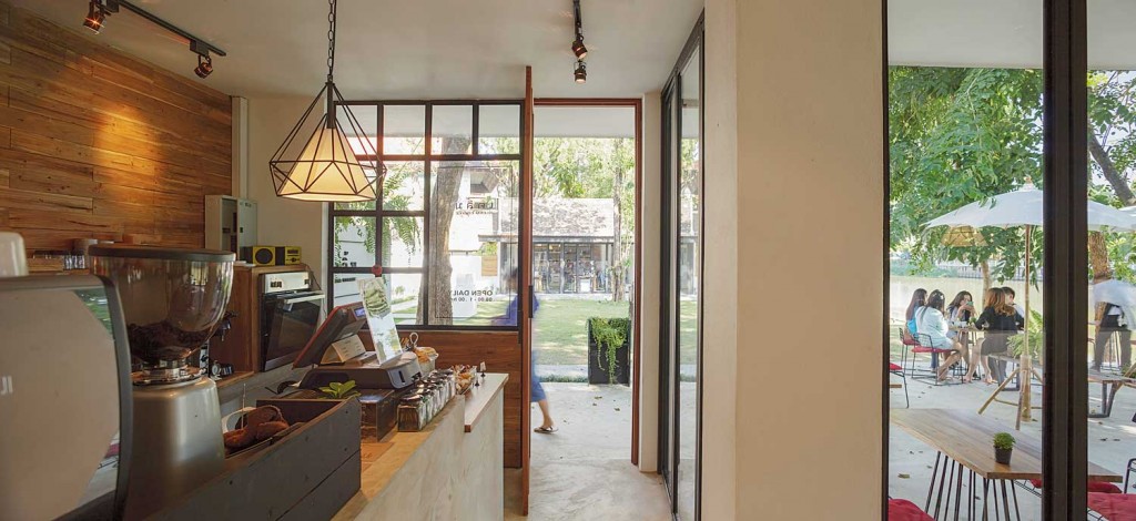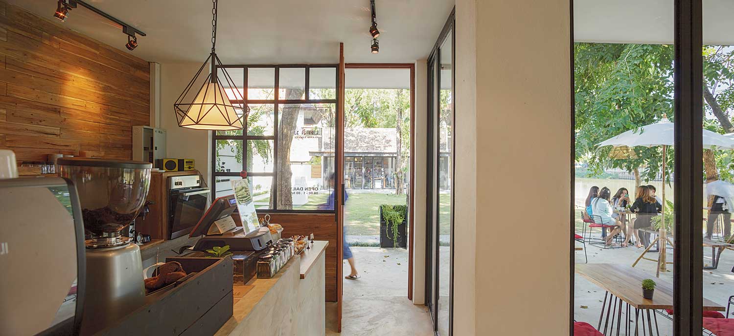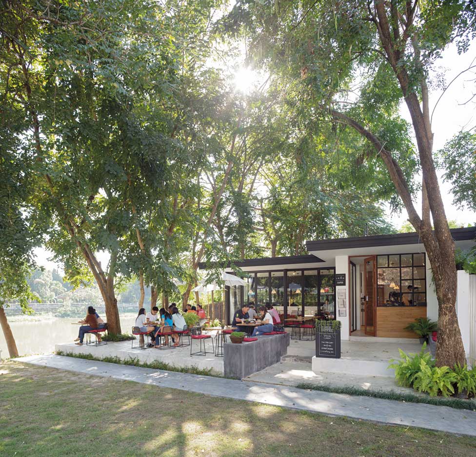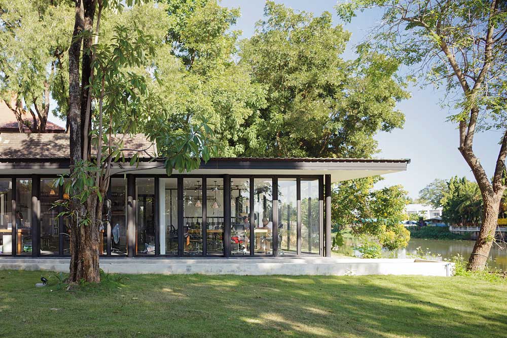 หากมองจากทางเข้าซึ่งเป็นถนนใหญ่ เราอาจคิดว่าตัวอาคารนั้นทึบตัน แต่ความจริงแล้วสิ่งนั้นเป็นเพียงอดีต คุณกิ๊ฟตัดสินใจทุบผนังและเพดานเดิมออกทั้งหมด พร้อมจัดวางแปลนใหม่ให้มีลักษณะเป็นรูปตัวยู (U) โดยไม่ให้มีอาคารปิดกั้นบริเวณที่ติดริมแม่น้ำปิง ลมจากแม่น้ำจึงพัดเข้ามาไหลเวียนรอบตัวอาคารทั้งสามหลังตลอดทั้งวัน อีกทั้งรอบบริเวณยังเต็มไปด้วยต้นไม้ใบหญ้า ช่วยสร้างบรรยากาศร่มรื่นเย็นสบาย สามารถมานั่งพักผ่อนได้ในตอนกลางวัน