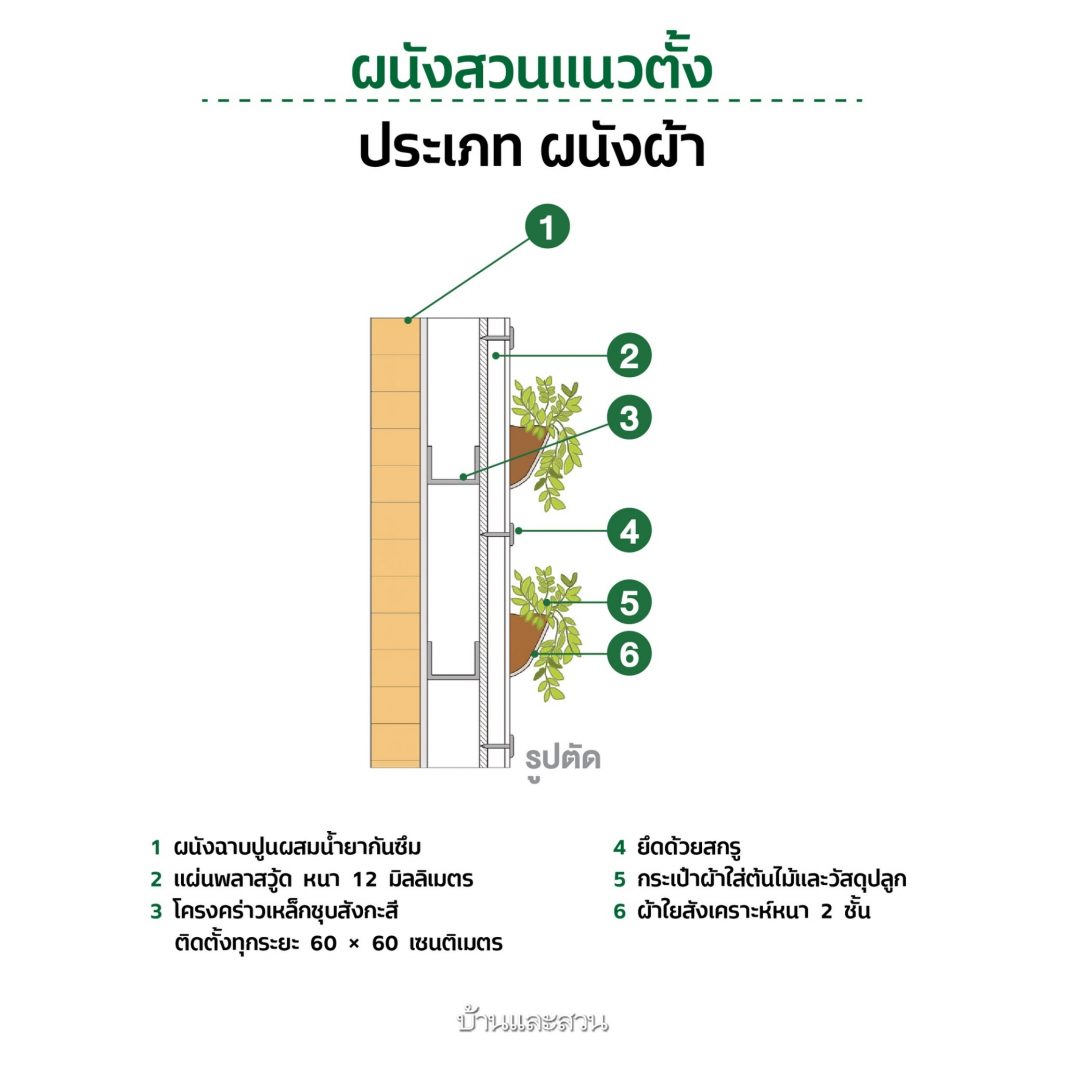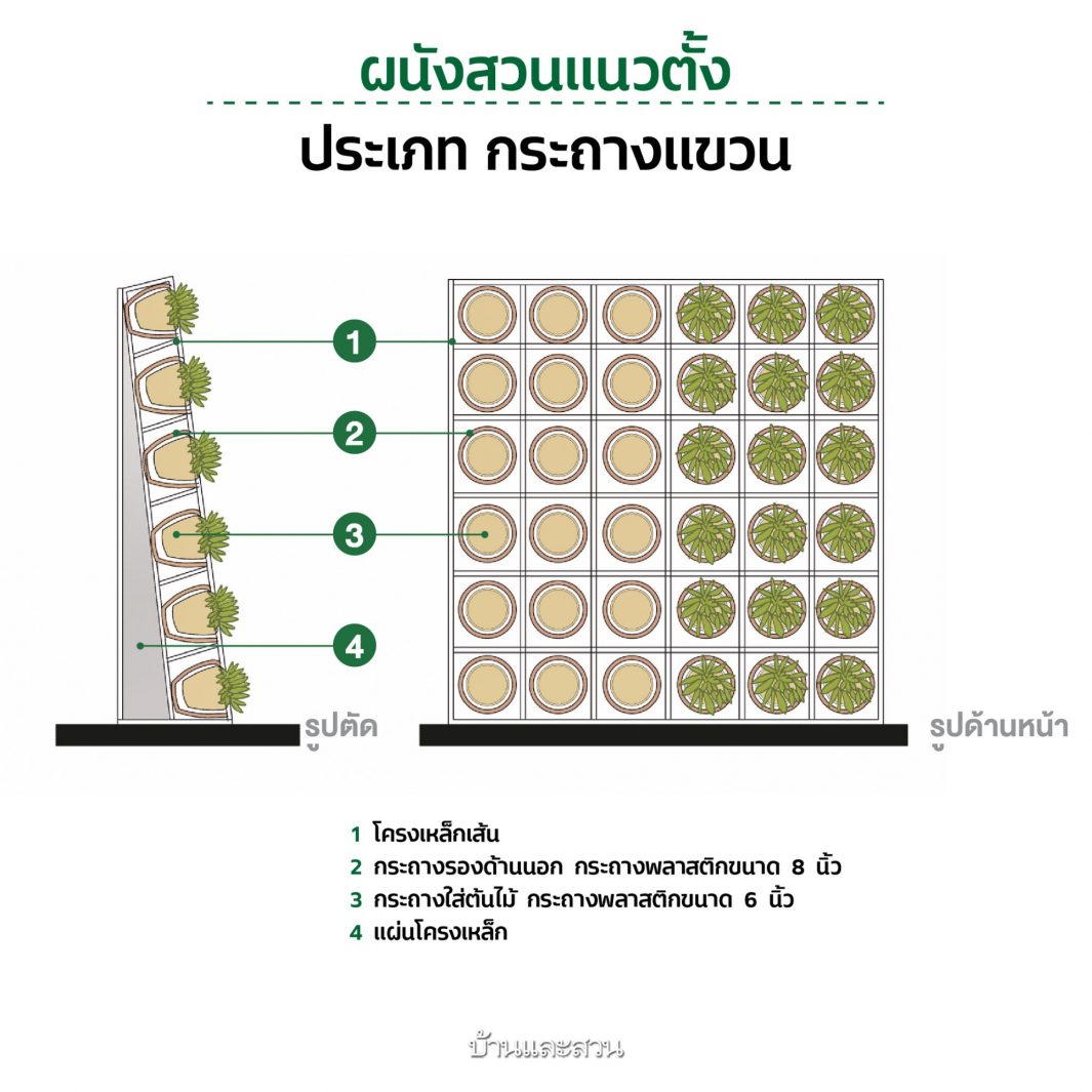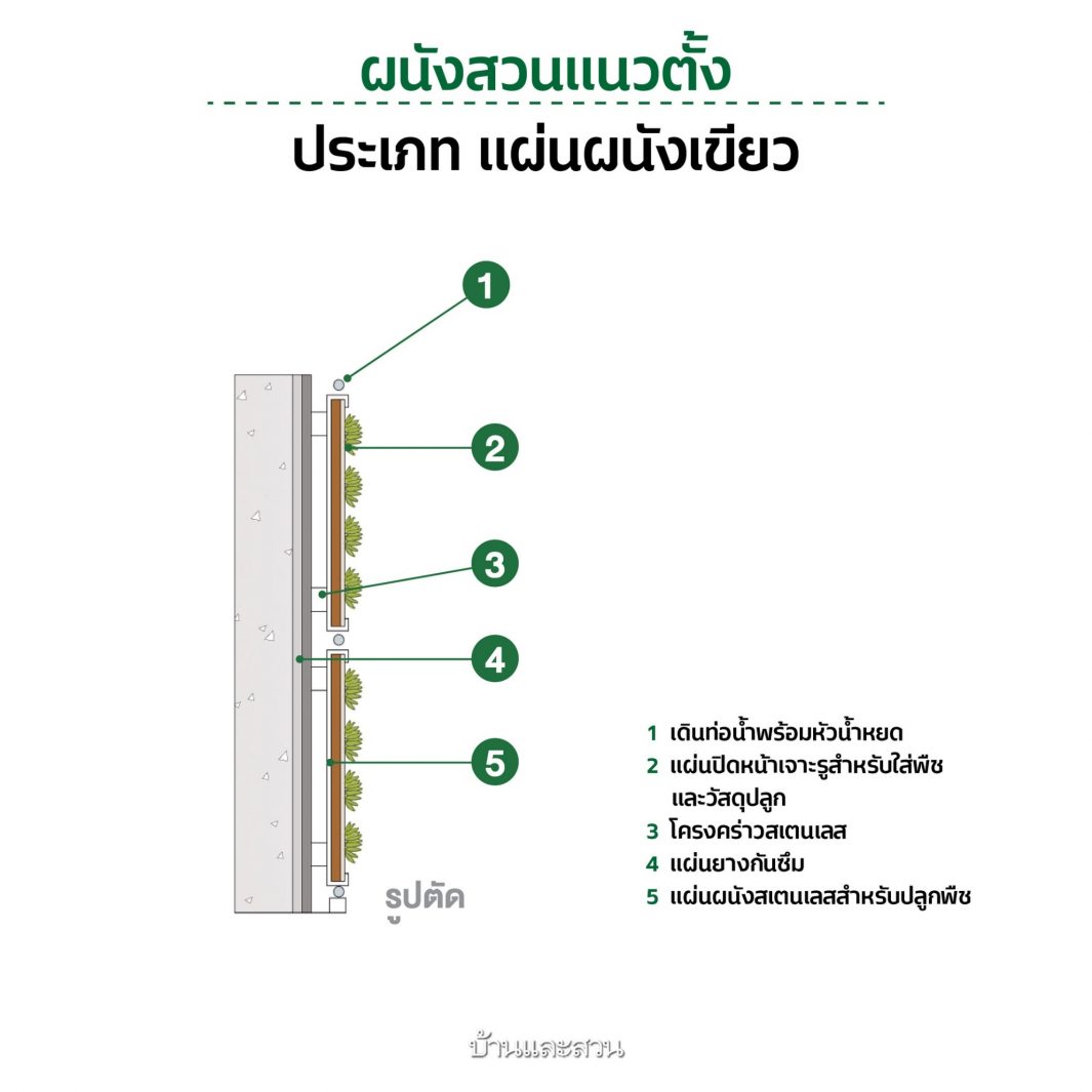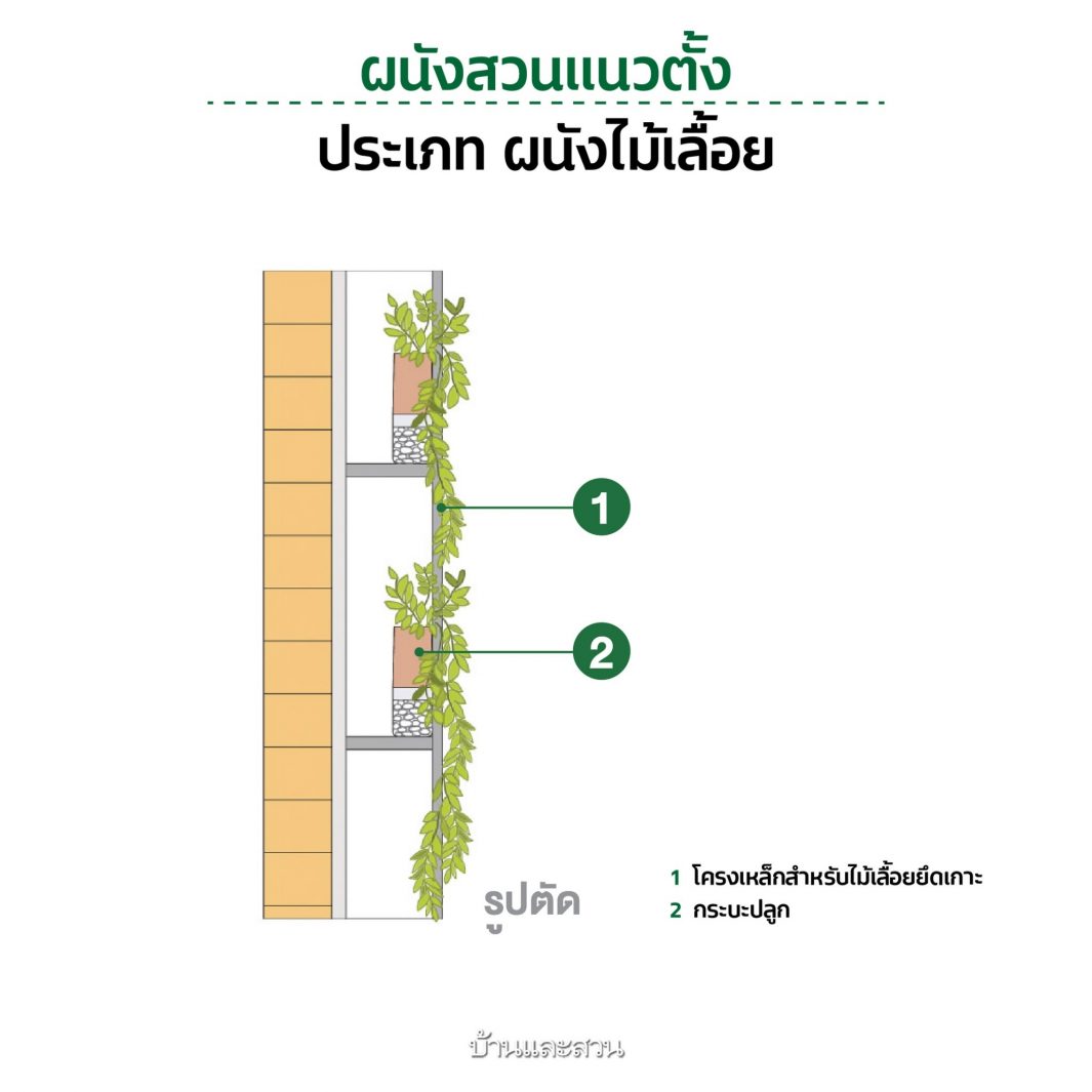 - ผนังสวนแนวตั้ง เป็นการนำแผ่นหรืออุปกรณ์ที่บรรจุวัสดุปลูกไปติดตั้งบนผนังอาคารอีกชั้นหนึ่ง