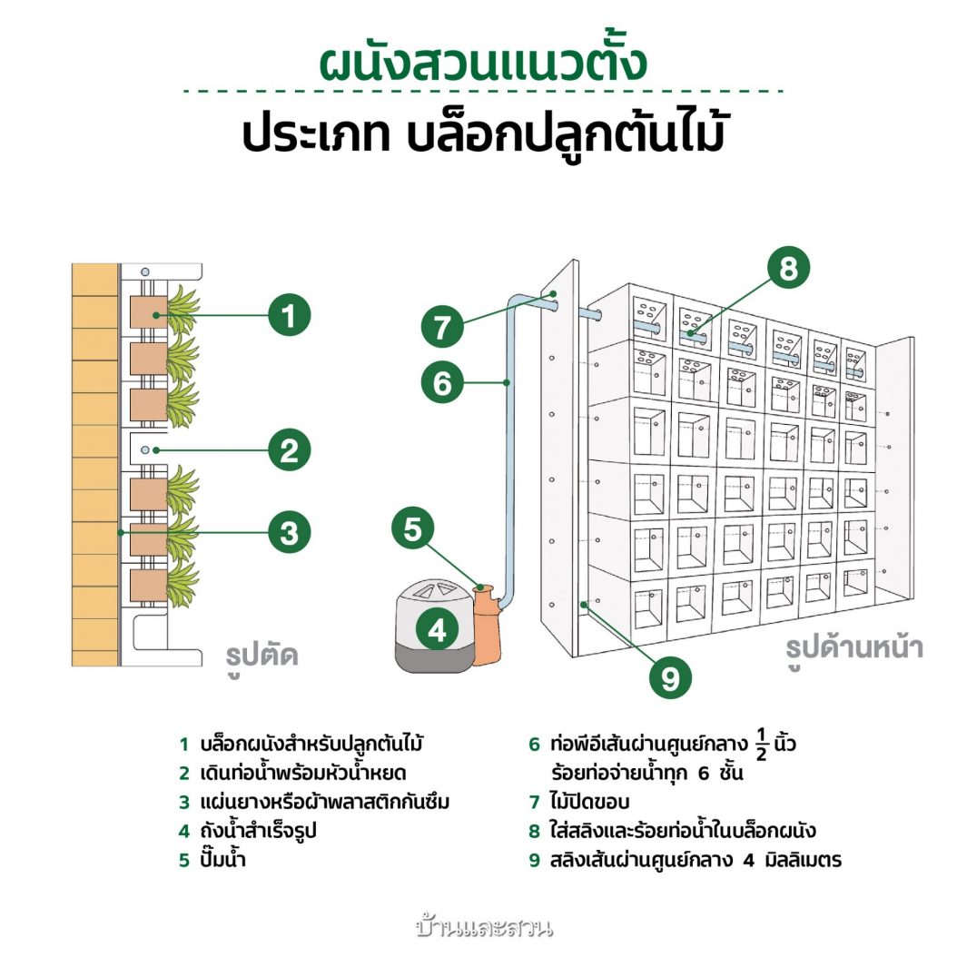 บล็อกปลูกต้นไม้ เป็นบล็อกที่มีช่องใส่ต้นไม้ อาจทำด้วยอิฐหรือคอนกรีต มีรูระบายน้ำผ่านทะลุแต่ละชั้นลงมา และวางท่อและหัวน้ำหยดไปตามบล็อก อาจก่อแนบผนังหรือก่อลอยตัวก็ได้ จึงสามารถติดตั้งโดยไม่ต้องมีโครงผนังยึดบล็อก แต่ต้องวางบนคานหรือพื้นรับน้ำหนักที่ได้ระดับ![]()