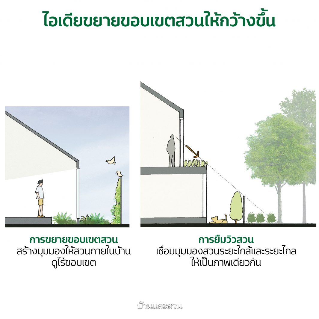 การขยายขอบเขตสวน สร้างมุมมองให้สวนภายในบ้านดูไร้ขอบเขต ด้วยการออกแบบให้ต่อเนื่องกับสวนภายนอกบ้านโดยกั้นด้วยผนังกระจกหรือประตูที่เปิด-ปิดได้ ก็จะทําให้การอยู่ภายในบ้านรู้สึกใกล้ชิดกับธรรมชาติได้โดยไม่ต้องเดินออกไปข้างนอก