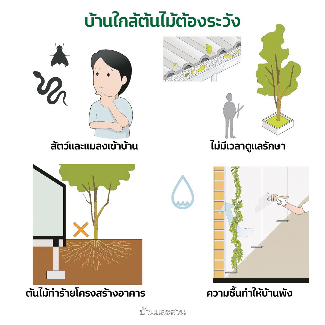 การออกแบบบ้านให้มีต้นไม้มาเป็นส่วนประกอบมีข้อดีหลายอย่าง ทั้งความสวยงาม สร้างความร่มรื่น ช่วยทำให้บ้านเย็น แต่ก็มีข้อควรระวังหลายจุดเช่นกัน
