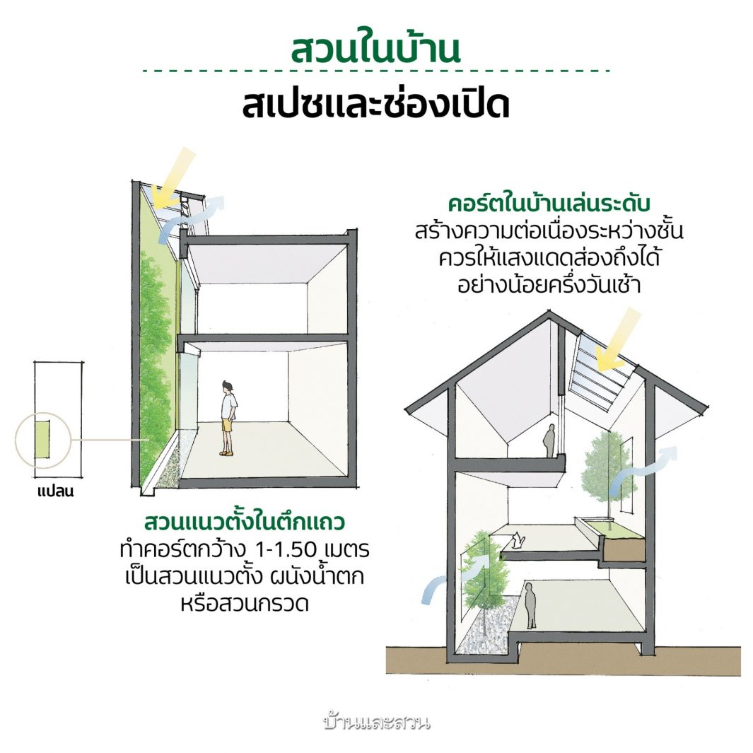 - สวนในบ้าน โดยออกแบบพื้นที่ภายในบ้านให้เป็นกระบะปลูกต้นไม้หรือพื้นที่จัดสวน ซึ่งอาจเป็นสวนภายในบ้านหรือสวนกึ่งภายนอก