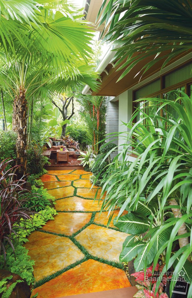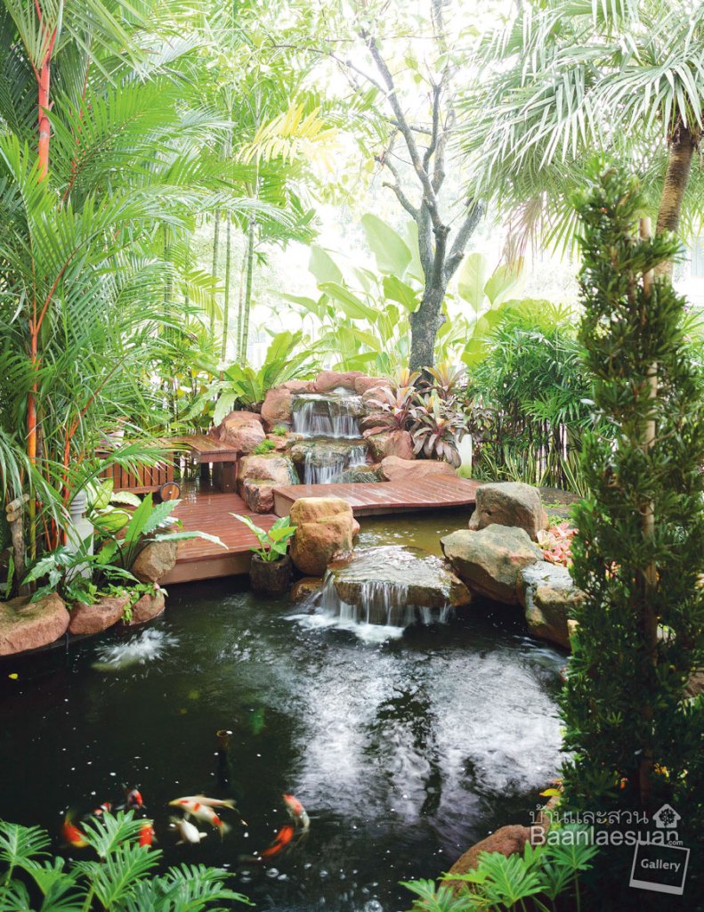 สวนนี้เริ่มต้นจากไม่มีการตกแต่งอะไรเลย เดิมทีมีแค่ต้นไม้ใหญ่ เช่น ปีบ แคนา และ กระโดน ด้วยความที่อยากให้สวนนี้มีชีวิตชีวา จึงเพิ่มต้นไม้ยืนต้นบางส่วนเข้าไป เช่น ลั่นทม ปาล์มยะวา โครงสร้างหลักๆของสวนมี 2 ส่วน คือ บ่อน้ำตก และ ทางเดินที่สดใส เพราะเจ้าของบ้านเป็นคนที่รักสีสันอยู่แล้ว บริเวณน้ำตก ทำเดคไม้ออกมาให้นั่งเล่นได้ จากพื้นที่ๆ ไม่เคยได้ใช้งานกลายเป็นพื้นที่ๆ นั่งคุยนั่งเล่น และยังเป็นมุมพักผ่อนสุดโปรดของเจ้าของบ้านอีกด้วย