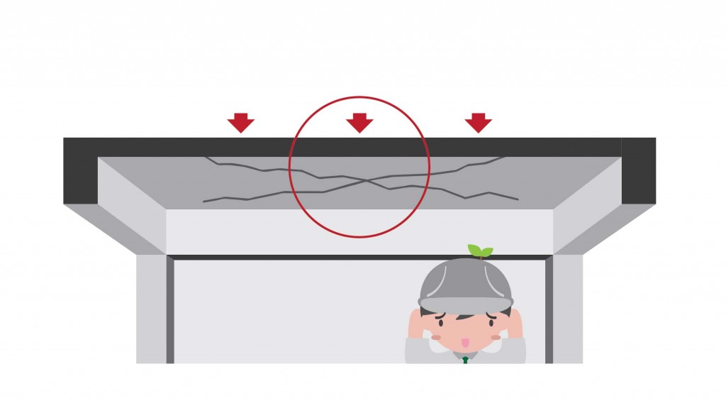ลักษณะเป็นเส้นตรงหรือเป็นรอยกากบาทร้าวเข้าหาเสา 4 เสา เกิดจากการที่พื้นรับน้ำหนักบรรทุกมากเกินไป ซึ่งอาจทำให้พื้นถล่มลงมาทั้งแผงได้