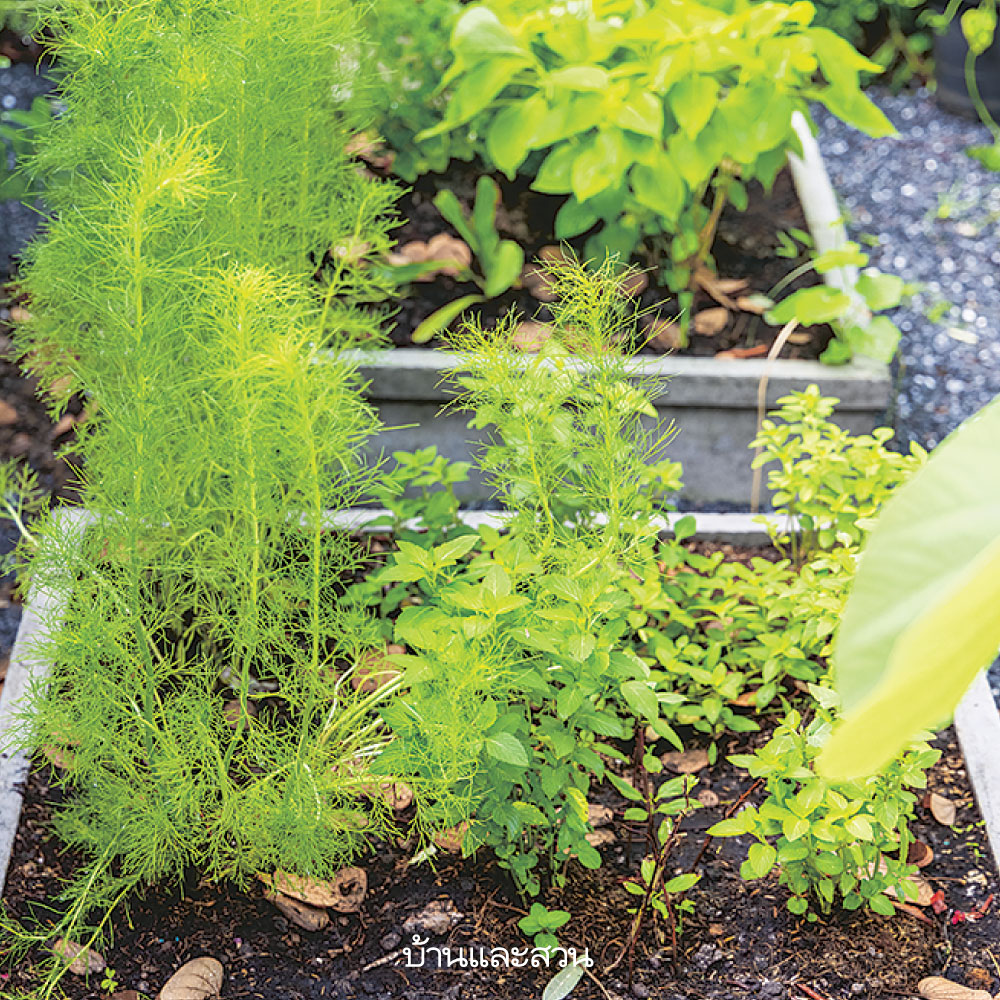 ตรงกลางสวนออกแบบเป็นคอร์ตยาร์ดที่มีบ่อน้ำพุเป็นจุดเด่น ช่วยให้แทรกองค์ประกอบและของแต่งสวนหลากหลายสไตล์ที่มีอยู่เดิม เช่น โอ่งมังกร กระถางดินเผา เฟอร์นิเจอร์ไม้ เหล็ก และอัลลอย อยู่ร่วมกันได้อย่างกลมกลืนและดูเป็นสัดส่วนมากขึ้น โดยมีกระบะปลูกเป็นตัวสร้าง แพตเทิร์นให้สวน ซึ่งสามารถปลูกพรรณไม้หลากหลายชนิดแทรกอยู่ร่วมกันอย่างเป็นระเบียบ อีกทั้งยังตัดแต่งและดูแลแปลงปลูกได้ง่ายมากขึ้น สามารถปล่อยให้ต้นไม้ได้แตกกิ่งก้านอย่างอิสระ