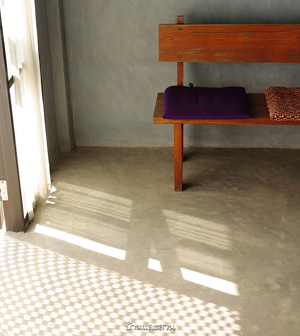 บ้านปูนเรียบโล่ง ที่สามารถมองออกไปเห็นวิวโดยรอบได้ 360 องศา ไม่ต้องมีอะไรมาบดบัง พร้อมสร้างเสน่ห์ให้บ้านด้วยการเลือกใช้วัสดุที่หาง่ายในท้องถิ่น อาทิ ไม้ กระเบื้องหลังคาลอนคู่ พื้นและผนังซีเมนต์ขัดมัน โดยใช้ช่างฝีมือในท้องถิ่นซึ่งไม่เน้นความ “เนี้ยบ” แต่ยังดูกลมกลืนเป็นหนึ่งเดียวกับธรรมชาติ