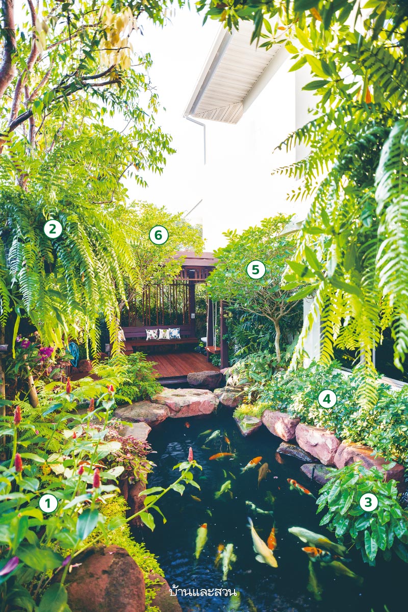 สวนสไตล์ทรอปิคัลในบ้านที่โอบล้อมด้วยตึกสูงระฟ้า มองภาพรวมเสมือนเป็นสวนคอร์ตยาร์ดขนาดย่อมๆ ที่ไม่ได้ให้ความสุขเฉพาะกับเจ้าของบ้าน แต่เพื่อนบ้านบนตึกสูงก็สามารถมองลงมาเห็นสวนสวยได้เช่นกัน ชานบันไดหน้ากว้างทำเป็นพื้นทรายล้าง ส่วนด้านล่างเป็นเทอร์เรซขนาดใหญ่ปูแผ่นไม้เทียม ด้านล่างซ่อนบ่อกรองและระบบกรองของบ่อปลาไว้ ตั้งใจให้เทอร์เรซยื่นเข้าไปในบ่อเพื่อให้รู้สึกใกล้ชิดกับสวนมากยิ่งขึ้น >>> อ่านเพิ่มเติมได้ที่นี่