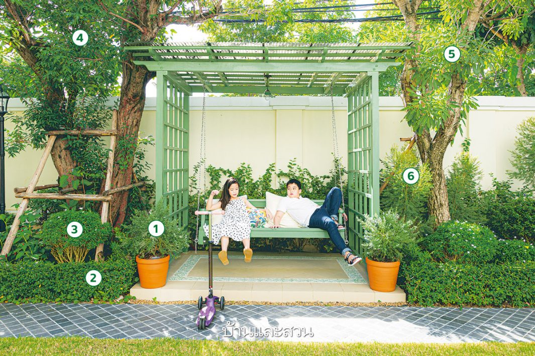 มุมชิงช้านั่งเล่นของเด็กๆ ซึ่งเปลี่ยนจากบ่อปลาตามที่ออกแบบไว้เดิม เพราะไม่อยากมีภาระต้องคอยดูแลให้ยุ่งยาก ซุ้มชิงช้าใช้เส้นตรงที่ดูเรียบง่าย และทาสีเขียวให้ดูกลืนไปกับต้นไม้รอบๆ ไม่ให้ดูเด่นจนเกินไป วางกระถางเทอราคอตตาสีส้มเด่นเติมสีสันความเป็นสวนสเปน >>> อ่านเพิ่มเติมได้ที่นี่
