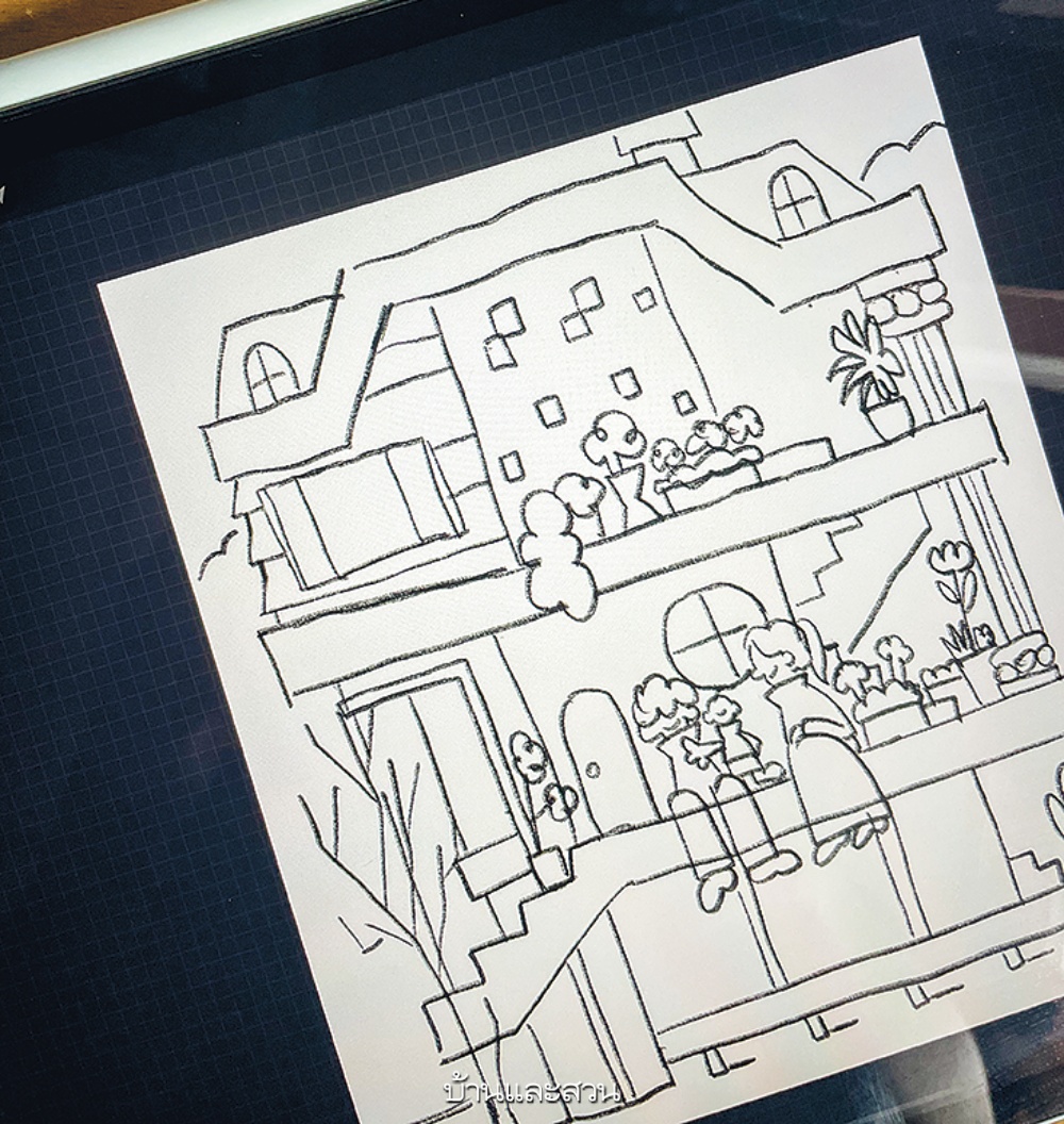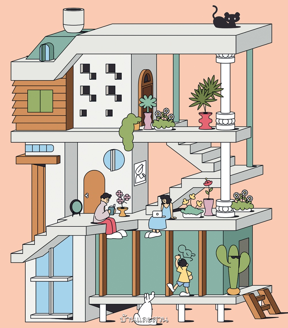 “ผมคิดว่าเป็นงานที่สนุกดีนะ เคยเห็นเคย อ่านนิตยสารบ้านและสวนมาตั้งแต่เด็ก เวลาไปบ้านญาติก็มักเห็นนิตยสารบ้านและสวนอยู่ที่บ้านด้วยเสมอ ผมว่าเป็นนิตยสารที่ดีที่ช่วยให้ไอเดียและสร้างแรงบันดาลใจให้คนอยากแต่งบ้าน พอได้โจทย์ เรื่อง ‘บ้านกับกาลเปลี่ยนแปลง’ ความคิดแรกของ ผมคืออยากวาดรูปทรงสถาปัตยกรรม อยากใส่ ประวัติศาสตร์ของสถาปัตยกรรมแต่ละยุคเข้าไป แต่พอวาดไปวาดมาถึงรู้สึกว่าไม่ต้องชัดขนาดนั้นก็ได้ แต่น่าจะเป็นภาพที่พูดถึงร่องรอยของกาลเวลาที่เปลี่ยนแปลงไป บ้านก็ยังมีโครงสร้างหลงเหลืออยู่ แต่เวลาทำ ให้เปลี่ยนแปลงและมีร่องรอยที่บอกถึง ช่วงเวลานั้นๆ อยู่ “ก็เลยเกิดเป็น‘Jigsaw House’ที่ผมอยาก ลองนำ ‘กาลเวลา’มาเสนอในรูปแบบของการต่อ จิ๊กซอว์แทนรูปแบบของบ้านในแต่ละยุคสมัยด้วย รูปฟอร์มต่างๆ แล้วค่อยนำ มาประกอบเป็นฟอร์ม ของบ้าน แล้วก็มีการปรับสเก็ตช์ไปมาจนกลายมา เป็นบ้านที่อยู่ในโทนอบอุ่นเหมือนบ้านในช่วงฤดูร้อน อาจเป็นเพราะเราเคยชินกับสภาพอากาศแบบนี้ก็ได้”