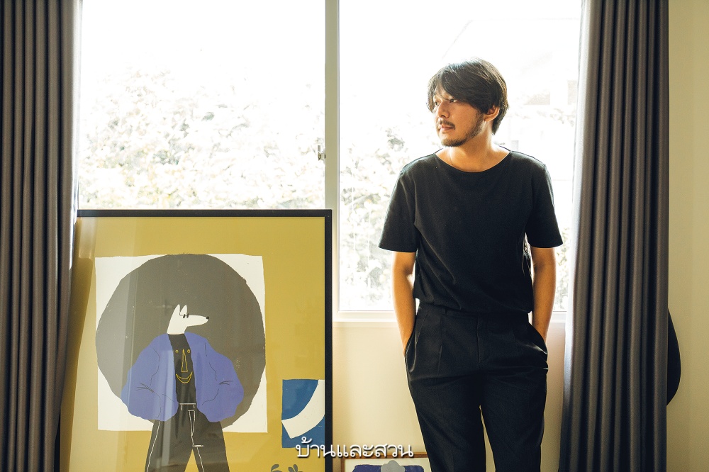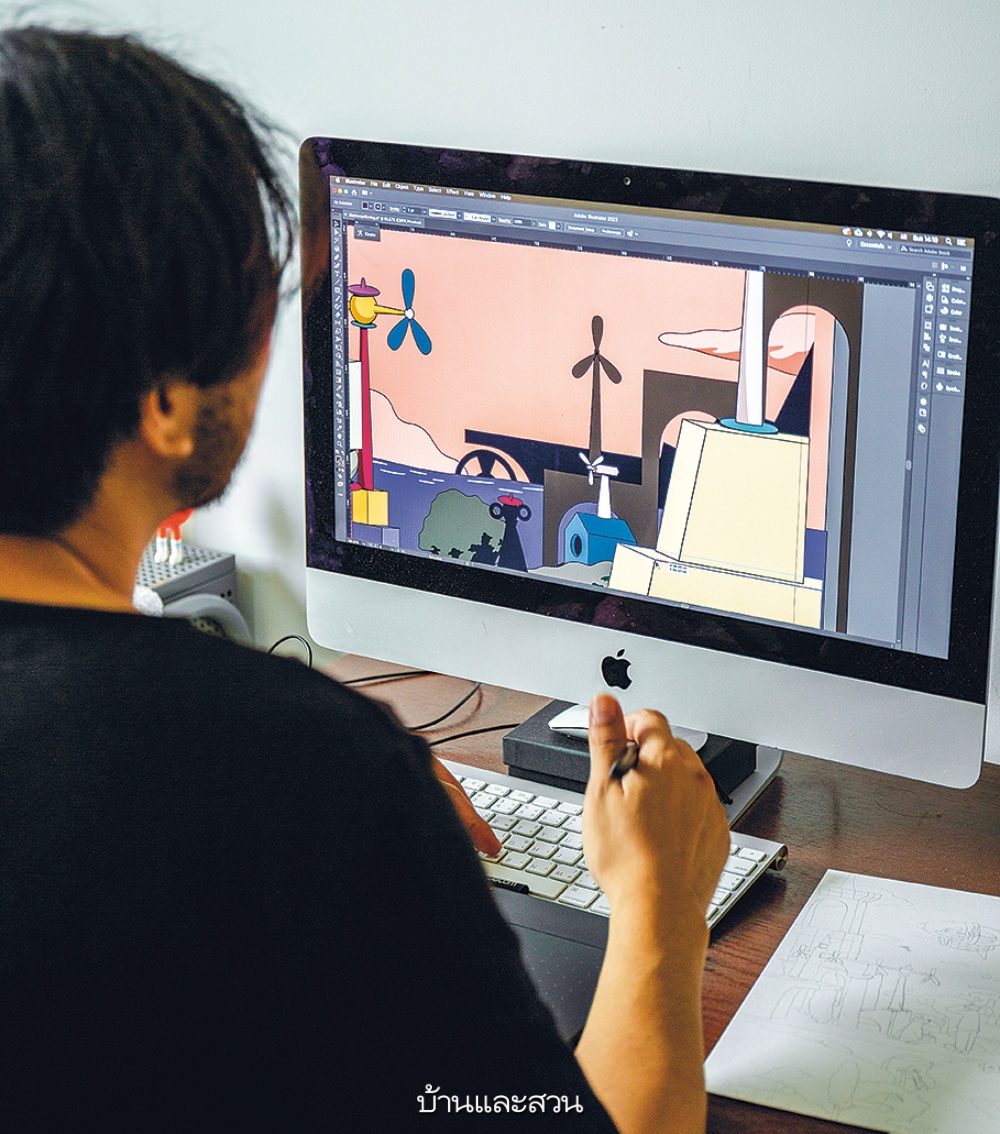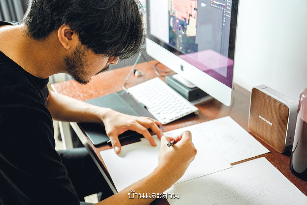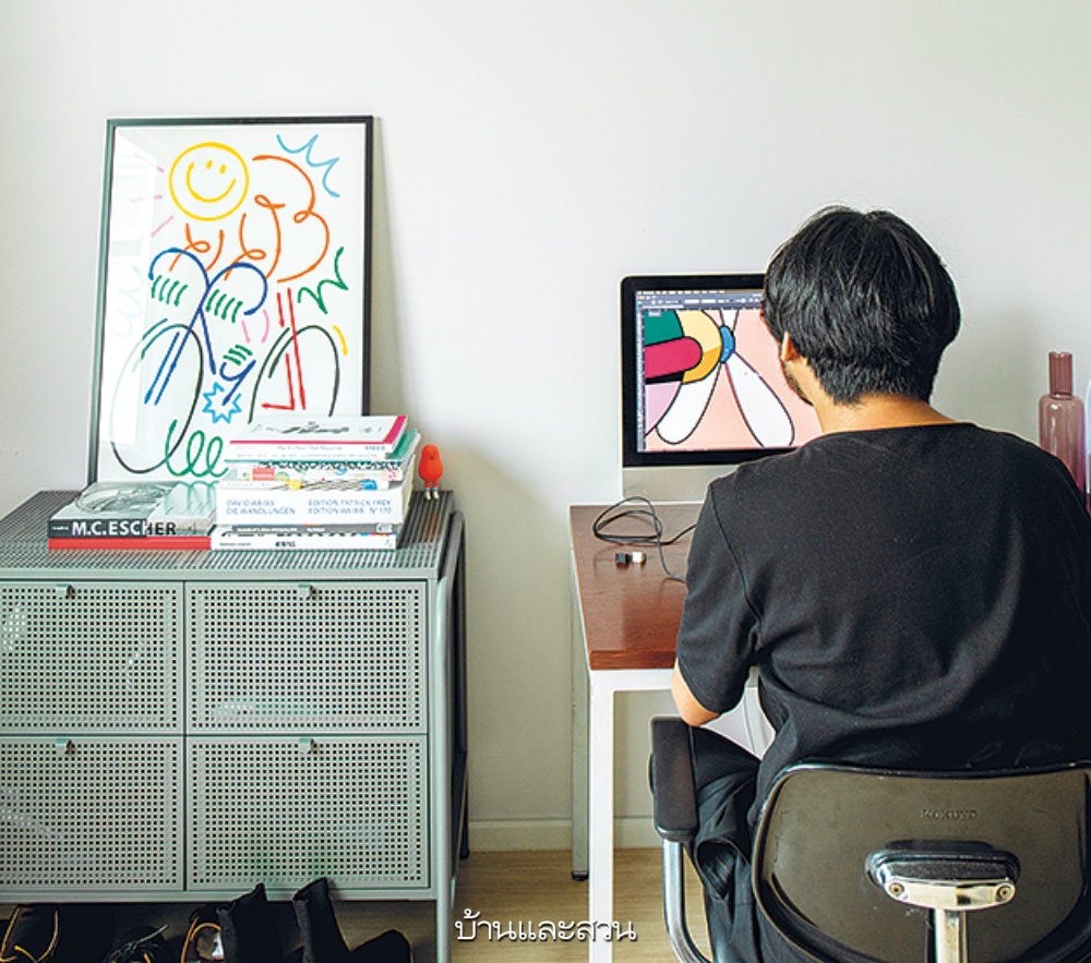 “ส่วนใหญ่งานผมวาดขึ้นบนคอมพิวเตอร์หรือไอแพ็ด ก็มีบ้างที่เริ่มสเก็ตช์จากการวาดมือบนกระดาษแล้วไปต่อในคอมพิวเตอร์ ซึ่งทั้งสองแบบให้ความสวยงามคนละมิติกัน ยุคสมัยนี้ลูกค้าส่วนใหญ่ ชอบงานจากคอมพิวเตอร์มากกว่าด้วย เพราะต้องการเส้นสายที่เรียบร้อยสะอาดตา แล้วก็นำ ไปใช้งานง่าย สำหรับผมก็ค่อนข้างชินกับการวาดแบบนี้ไปแล้ว มันง่ายทั้งเวลาปรับแก้ไขและขั้นตอนการส่งงานไปใช้ต่อด้วย ผมคิดว่างานตัวเองยังไม่นิ่งนะ ยังอยากทดลองไปเรื่อยๆ อาจเป็นรูปทรงที่ฟรีฟอร์มและออร์แกนิกมากขึ้น อย่างเท็กซ์เจอร์ปูนหรือรอยแตกบนผนัง และก็อยากลองทำงานเพ้นต์ที่ไม่คอมเมอร์เชียลดูบ้าง ค่อยๆ วาดสะสมงานที่เป็นตัวตนของเรา แล้วค่อยรวมมาจัดแสดงต่อไปในอนาคต”