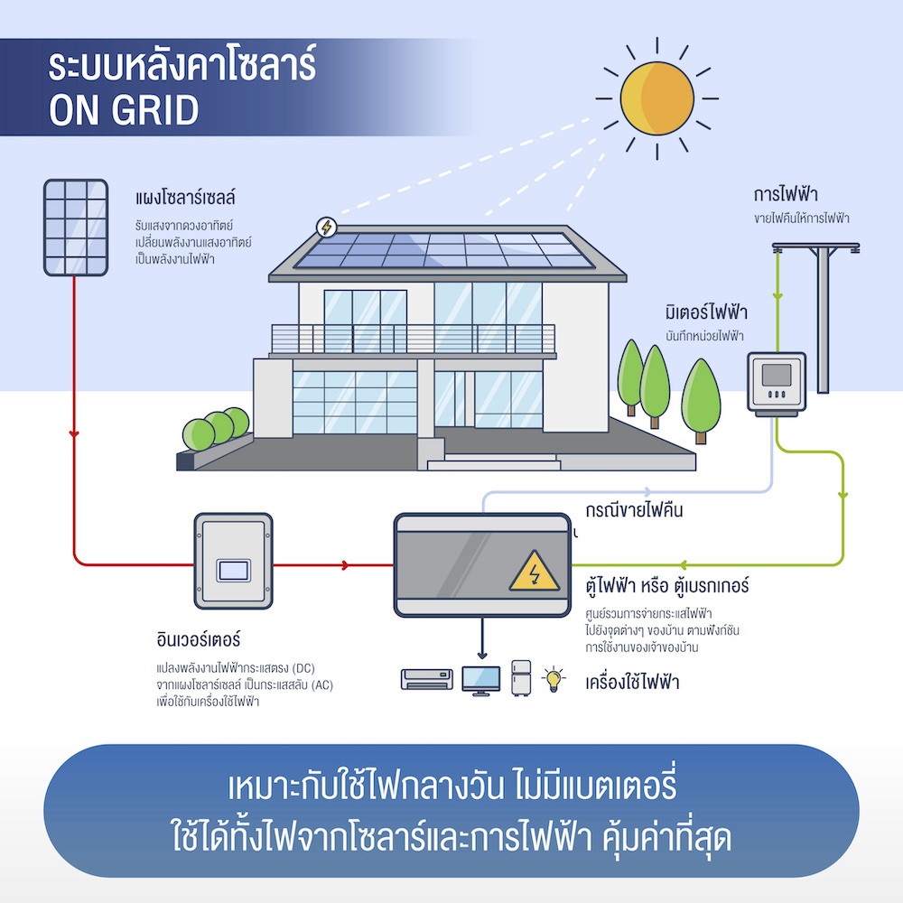 - ออนกริด (On-Grid) ใช้ทั้งไฟจากโซลาร์ และการไฟฟ้า ไม่มีแบตเตอรี่