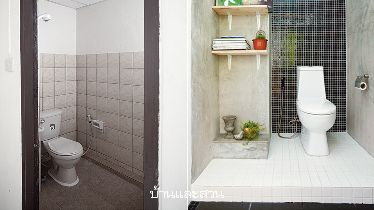 ห้องน้ำที่ปรับเปลี่ยนฟังก์ชันใหม่แม้ว่าจะมีขนาดเท่าเดิม แต่ก็ดูน่าใช้งานและแยกสัดส่วนมากขึ้น มีการใช้กระเบื้องแต่ละส่วนต่างขนาดกัน เพื่อให้เหมาะสมกับพื้นที่ในแต่ละจุด เน้นโทนสีขาว ดำ และปูนเปลือย ให้ดูเป็นห้องน้ำที่เรียบง่ายแต่ก็เท่อยู่ในที