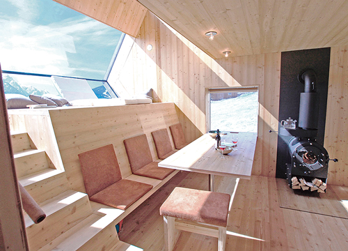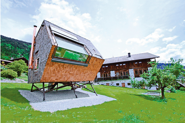 “Ufogel” เป็นบ้านพักตากอากาศในประเทศออสเตรีย ก่อสร้างจากไม้สนพื้นถิ่น หน้าตาของบ้านดูคล้ายนกปนยานอวกาศ มีขนาดกว้างและยาวด้านละ 6.30 เมตร ตัวบ้านสูงประมาณ 5.50 เมตร (ไม่รวมส่วนขาเหล็ก) แต่ภายในมีพื้นที่ใช้สอยถึง 45 ตารางเมตร มีการจัดวางฟังก์ชันที่ดี ทำให้อยู่อาศัยได้ 4 คนแบบสบายๆ โดยสถาปนิกออกแบบพื้นที่ใช้สอยให้กระชับแต่ใช้งานได้จริงด้วยเทคนิคง่ายๆ แบบบ้านขนาดเล็ก