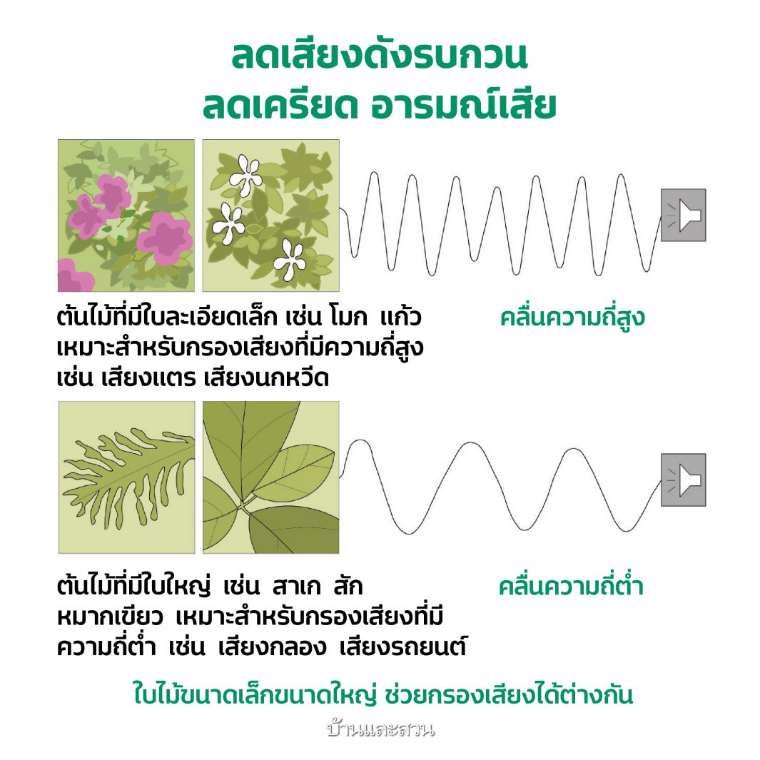 - ปลูกต้นไม้เป็นแนวในทิศทางหรือพื้นที่คาดว่าจะมีเสียงดังรบกวนจากภายนอก เพื่อกรองและลดทอนเสียงรบกวนเข้ามาในบ้านได้ระดับหนึ่ง