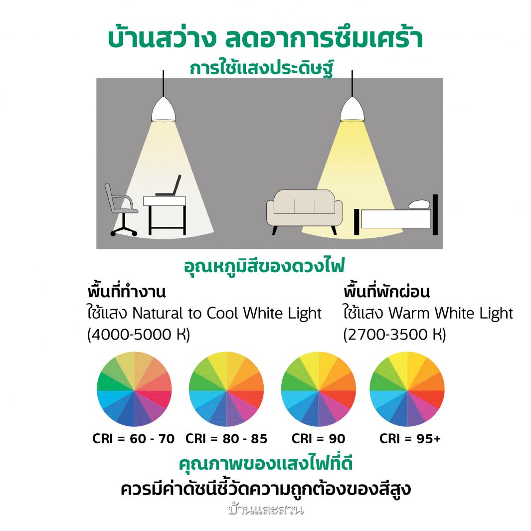 - การเลือกอุณหภูมิสีของดวงไฟ พื้นที่ทำงาน ควรเลือกค่าอุณหภูมิสีของแสง (The Color Temperature) Natural to Cool White Light (ค่าอุณหภูมิสีของแสง 4000-5000K ) จะช่วยสร้างบรรยากาศที่ตื่นตัว และช่วยสร้างสมาธิให้จดจ่อกับงานได้ดี พื้นที่พักผ่อน ห้องนอน ห้องนั่งเล่น แนะนำให้เลือกแสง Warm White Light (ค่าอุณหภูมิสีของแสง 2700-3500K) เป็นแสงสว่างสีส้มนวลๆ สร้างความรู้สึกอบอุ่น ผ่อนคลาย ชวนพักผ่อน และช่วยเน้นสีของอาหารดูน่ารับประทาน กระตุ้นความอยากอาหารให้เด็กและผู้สูงอายุได้ดี