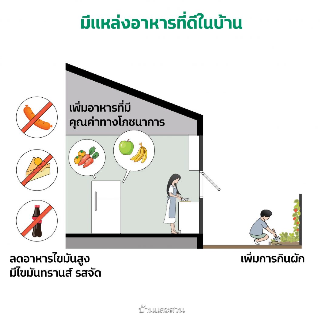 - เพิ่มอาหารที่มีคุณค่าทางโภชนาการ เช่น เมนูผัก ผลไม้ โดยเริ่มเปลี่ยนสัดส่วนการเก็บอาหารในตู้เย็นให้เป็นอาหารที่มีประโยชน์มากกว่า เพื่อปรับพฤติกรรมของเราเอง