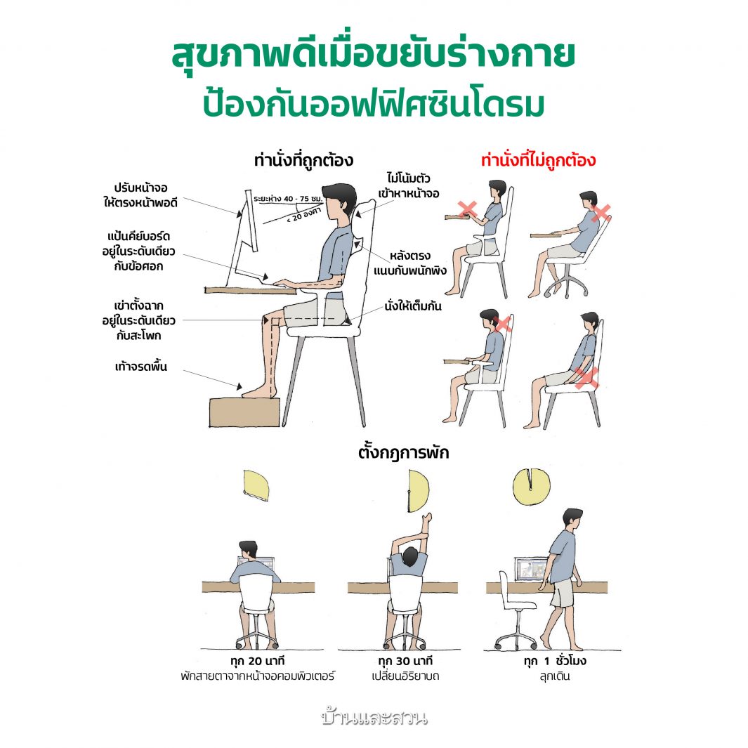 - พักเบรกบ่อยๆ พักสายตาจากจอคอมพิวเตอร์และลุกขึ้นเปลี่ยนอิริยาบถระหว่างวัน อาจมีการลุกขึ้น หรือขยับร่างกายจากการนั่งทำงานหน้าจอทุก 30 นาที