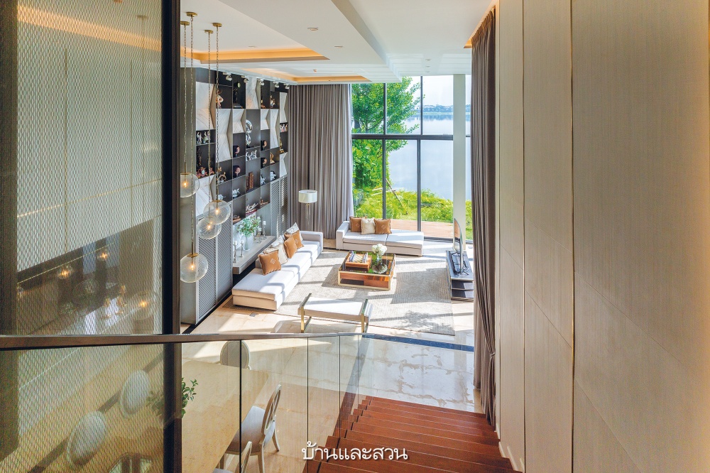 เมื่อบ้านอยู่ในทำเลที่ดีแล้ว สถาปนิกจึงออกแบบการใช้พื้นที่ให้เต็มศักยภาพ “มีการออกแบบให้เปิดรับลมธรรมชาติได้ ทุกห้องจึงสามารถอยู่ได้โดยไม่จำเป็นต้องใช้แอร์ตลอดเวลา มีการเชื่อมต่อพื้นที่ระหว่างภายนอกกับภายในแบบ Inside-out และ Outside-in ที่เชื่อมต่อทั้งสเปซและมุมมอง ทำให้แม้จะนั่งอยู่ภายในบ้านก็เสมือนนั่งเล่นอยู่ในสวนริมน้ำที่แวดล้อมด้วยธรรมชาติได้ ห้องรับรองออกแบบให้มีหน้ากว้างกว่า 10 เมตร ส่วนห้องนั่งเล่นในโซนพักผ่อนจะได้หน้ากว้างไม่มาก แต่ทำห้องยื่นออกไปให้เปิดมุมมองกว้างได้สองด้าน รูปทรงบ้านโดยรวมเป็นทรงสี่เหลี่ยม แต่ออกแบบให้มีการคั่นด้วยพื้นที่ว่างเพื่อแยกกลุ่มห้องออกจากกันให้เปิดมุมมองได้กว้างขึ้น”