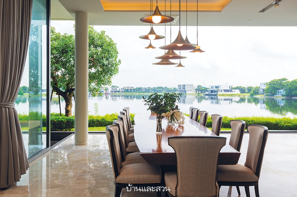 “เจ้าของบ้านชอบบ้านแบบทรอปิคัลโมเดิร์นที่เน้นให้ดูแลรักษาง่าย กันแดดกันฝนได้ดี บ้านริมบึงแบบนี้ แม้จะเปิดโล่งแต่ก็ไม่เสียความเป็นส่วนตัว จึงเน้นความต่อเนื่องกับพื้นที่ริมน้ำซึ่งเป็นทะเลสาบส่วนตัวของโครงการที่มีการทำกำแพงกันดินแล้ว จึงสามารถสร้างบ้านห่างจากเขตที่ดินได้ตามปกติ ออกแบบแนวพุ่มไม้แทนการทำรั้ว สร้างมุมมองให้ดูกว้างต่อเนื่องกับธรรมชาติ มีเรื่องที่ต้องระมัดระวังคือสัตว์และแมลงที่อาจมากับน้ำ จึงเลือกใช้ระบบประตูที่ปิดได้สนิท ส่วนภายในบ้านตกแต่งสไตล์คลาสสิกร่วมสมัยให้เข้ากับของสะสมซึ่งเป็นตุ๊กตาเคลือบจากต่างประเทศ จึงเน้นโทนสีครีมและโทนสีนิวทรัลที่ดูสบายตา”