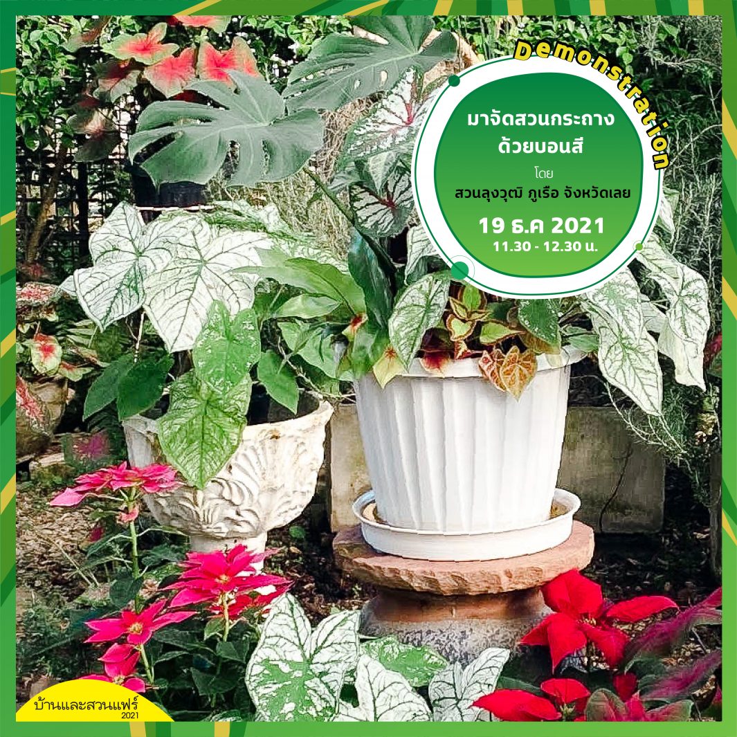 ใครที่รักบอนสีหรือมีบอนสีที่บ้านไม่ควรพลาดกับกิจกรรมสาธิตการจัดสวนกระถางด้วยบอนสีให้สวยงามลงตัว สามารถไปวางในสวนหรือมุมต่างๆในบ้านได้ไม่อายใคร รวมไปถึงเทคนิคการปลูกบอนสีให้ใบสวยไม่พักตัว โดยวิทยากรนักปลุกบอนสีตัวยง คุณยุ่น-ธมนวรรณ เชยกลิ่นเทศ แห่ง สวนลุงวุฒิ ภูเรือ จังหวัดเลย
