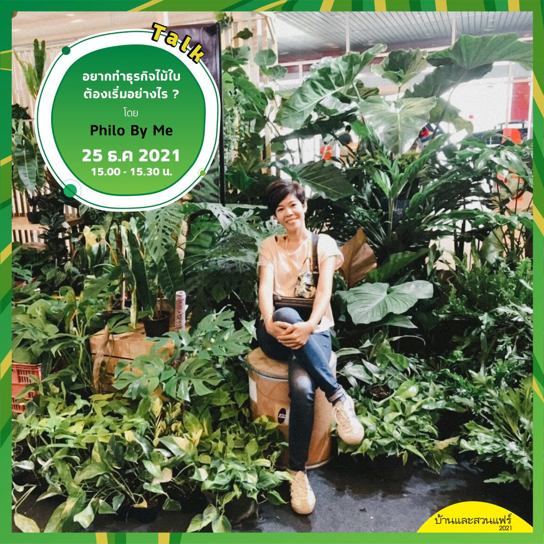 เทคนิคการเลือกไม้ใบมาปลูกให้ไม่ตาย รวมไปถึงการบำรุงและดูและต้นไม้ใบชนิดต่างๆ จากนักสะสมและจำหน่ายไม้ใบที่มีชื่อเสียงในวงการนักสะสมไม้ใบ โดยวิทยากร คุณนก-นภารัตน์ จุ่มศรี แห่งร้าน Philo By Me