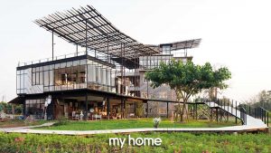 “ตอนที่ออกแบบบ้านผมยังโสด ก็ต้องการระเบียงริมน้ำไว้ปาร์ตี้สบายๆกับเพื่อนฝูง จึงเน้นระเบียงขนาดใหญ่ ภายในบ้านก็ง่ายๆ มีแค่ห้องนอน ห้องน้ำ และห้องรับแขกที่ปรับเปลี่ยนเป็นห้องนอนได้จริงๆ แล้วบ้านหลังนี้ผมอุปมาเหมือนค่อยๆเดินเข้ามาในป่า ผมแอบเรียกว่าเป็นสไตล์ Jungle Modern คือบ้านโมเดิร์นที่มีอารมณ์ของป่านิดๆ แอบใส่ความตื่นเต้นด้วยพื้นหรือหลังคากระจกเป็นบางช่วง”