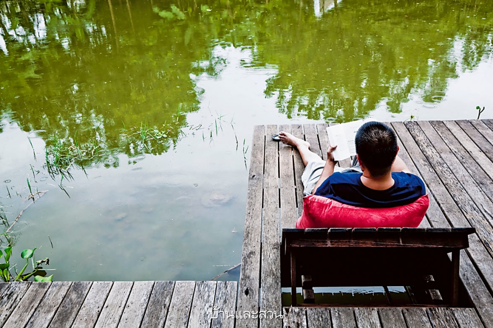 บ้านชั้นเดียวของคุณจักษ์สร้างอยู่บนสระน้ำขนาดใหญ่ที่ขุดไว้เพื่อนำดินมาทำเขื่อนรอบๆบ้าน ป้องกันน้ำท่วม ซึ่งคุณพ่อเลี้ยงปลาไว้หลายชนิด ทั้งปลาบึก ปลาดุกรัสเซีย ปลาทับทิม ปลาแรด ปลาตะเพียน และปลาคาร์ป นอกจากจะได้วิวสวย สระน้ำยังช่วยลดความร้อนที่จะเข้าสู่ตัวบ้าน
