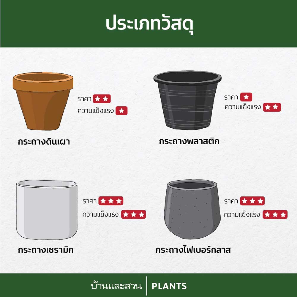- กระถางไฟเบอร์กลาส วัสดุสมัยใหม่ยอดนิยม คงทน น้ำหนักเบา และให้ความรู้สึกเหมือนวัสดุจากธรรมชาติ ทำเลียนแบบวัสดุอื่นได้อย่างแนบเนียน แต่ราคาค่อนข้างสูงด้วยเช่นกัน