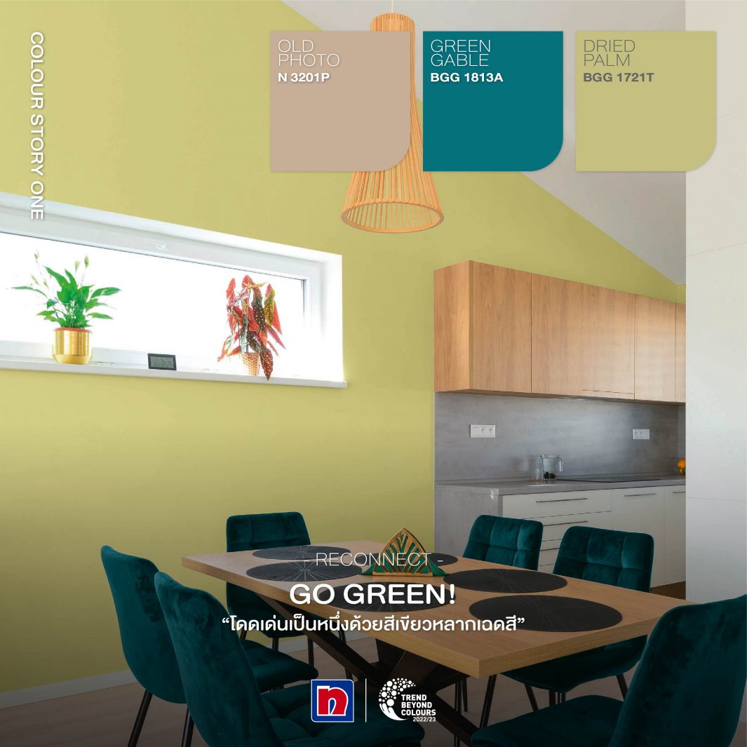 สีเขียวอมเหลืองอย่าง DRIED PALM และสีเขียวน้ำเงินอย่าง GREEN GABLE เมื่อนำมาจับคู่กันแล้ว จะเกิดเป็นความกลมกลืน และสร้างสมดุลของชุดสีเขียว เพิ่มสัมผัสอันนุ่มนวลด้วยสีโทนอุ่นอย่าง OLD PHOTO เพื่อสร้างความเชื่อมโยงที่สมบูรณ์แบบ เข้ากันดีกับเฟอร์นิเจอร์และพื้นไม้ได้อย่างดี