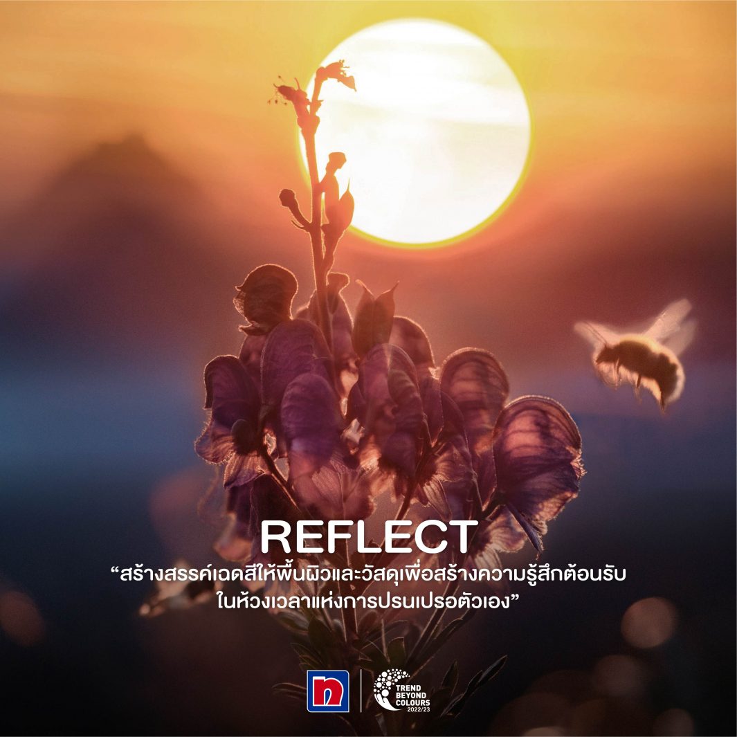 REFLECT คือการอนุญาตให้ตนเองมีห้วงเวลาอันแท้จริงในการปิติอยู่กับสิ่งเล็ก ๆ เพราะคือสุขที่แท้ อาจจะเป็นธรรมชาติอันงดงาม สิ่งที่สะท้อนออกมาจากเฉดสีนี้ คือสีสันอันเปี่ยมด้วยการตามใจตนเองอย่างอ่อนโยน ด้วยโทนสีกลางที่ดูนิ่มนวล ลดทอนความจัดจ้านลง เพื่อสลายความมีตัวตน