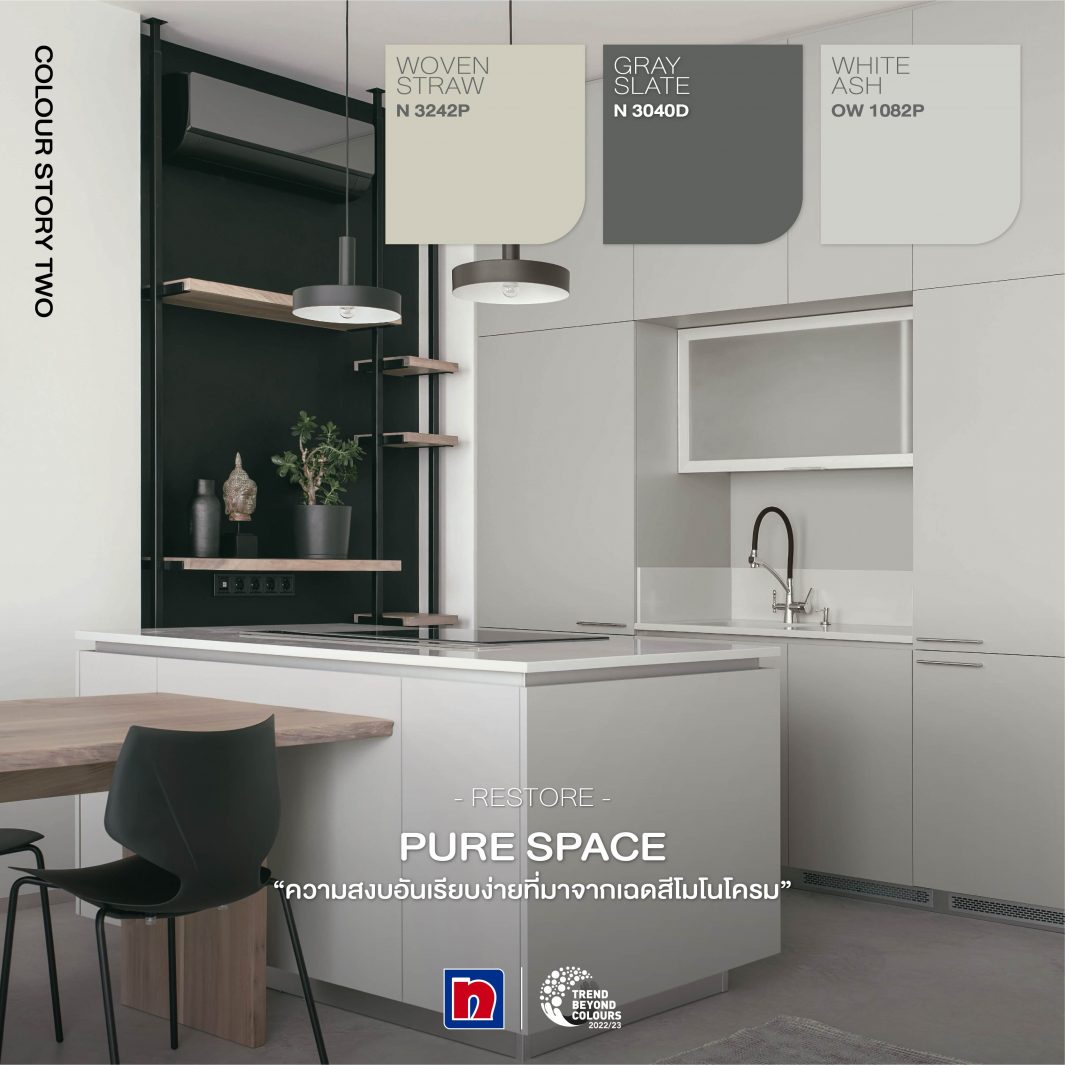 ความสงบอันเรียบง่ายมาจากเฉดสีแบบโมโนโครม เสริมรายละเอียดและมิติให้กับสเปซ ด้วยสีเทาอ่อน White Ash สีเทาเข้ม Gray Slate และสีเทาอบอุ่น Woven Straw เมื่อผสมผสานกับงานกราฟิก เฟอร์นิเจอร์ดีไซน์เท่ และการตกแต่งผนัง ยิ่งช่วยสร้างความโดดเด่นให้กับสเปซ