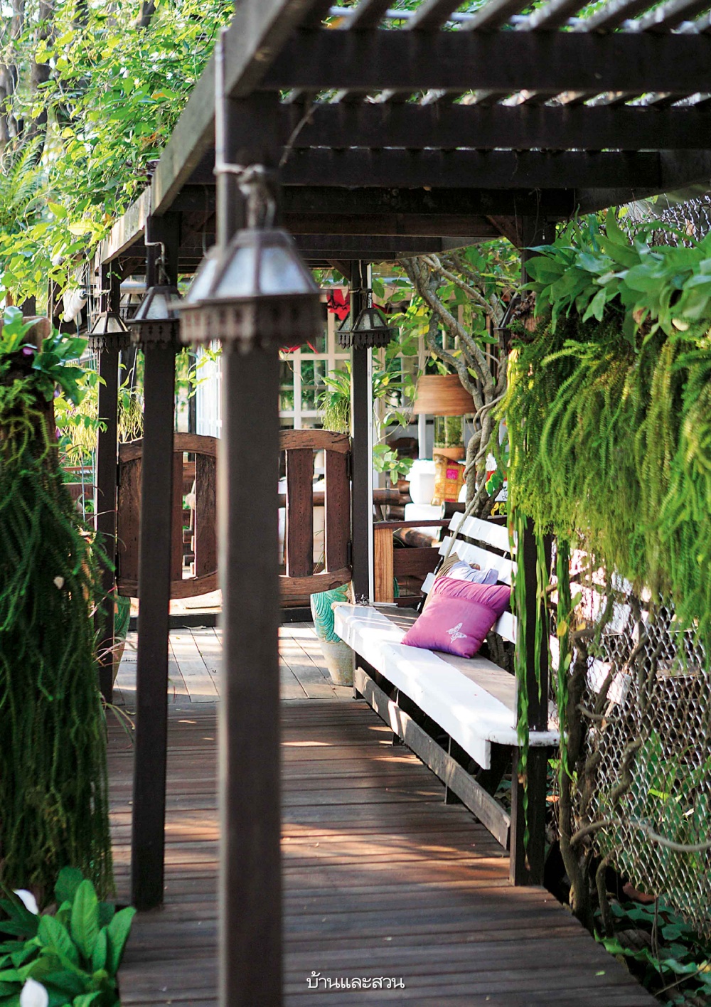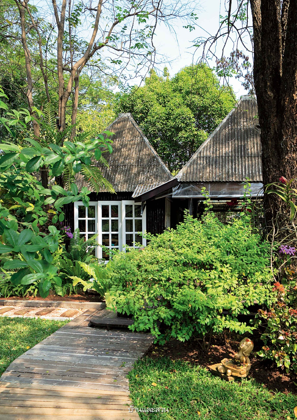 ระหว่างที่ทุ่มเทกับการทำสวน เมื่อยามที่รู้สึกเหนื่อยล้าอยากจะพักก็กลับไม่มีพื้นที่ให้ผ่อนคลายเลย คุณผจงกิติ์จึงเริ่มมองหาพื้นที่นั่งเล่นและพักผ่อน ตามมาด้วยบ้านพักหลังเล็กๆ แม้เธอจะไม่ได้มีความรู้ด้านการออกแบบ แต่กับบ้านหลังนี้เธอเลือกใช้โครงสร้างแบบง่ายๆ เป็น บ้านไม้ชั้นเดียว ที่เธอออกแบบด้วยตัวเอง โดยกำหนดให้ส่วนรับแขกและครัวอยู่นอกบ้าน ภายในบ้านมีพื้นที่นั่งเล่นก่อนเข้าสู่ห้องนอนและห้องน้ำ การตกแต่งภายในส่วนใหญ่ใช้เฟอร์นิเจอร์ลอยตัว เน้นที่ทำจากไม้และหวาย ซึ่งดูเข้ากับโครงสร้างไม้ของตัวบ้าน รวมถึงนำไม้ไผ่และของสะสมสมัยก่อนมาเป็นส่วนตกแต่งด้วย แต่ที่เราประทับใจที่สุดคือห้องอาบน้ำที่อยู่ด้านในสุด ภายในมีการแยกส่วนเปียกและส่วนแห้งชัดเจน ส่วนอาบน้ำมีลักษณะคล้ายกับการอาบน้ำฝนภายใต้ร่มไม้ใหญ่ เพราะหลังคาเป็นแบบโปร่งใส จึงมองเห็นธรรมชาติโดยรอบ และมีฝักบัวแบบเรนชาวเวอร์ที่เดินท่อน้ำอย่างง่ายๆเป็นส่วนเดียวกับโครงสร้างหลังคา ทำให้การอาบน้ำกลายเป็นช่วงเวลาของการผ่อนคลายทั้งกายและใจ