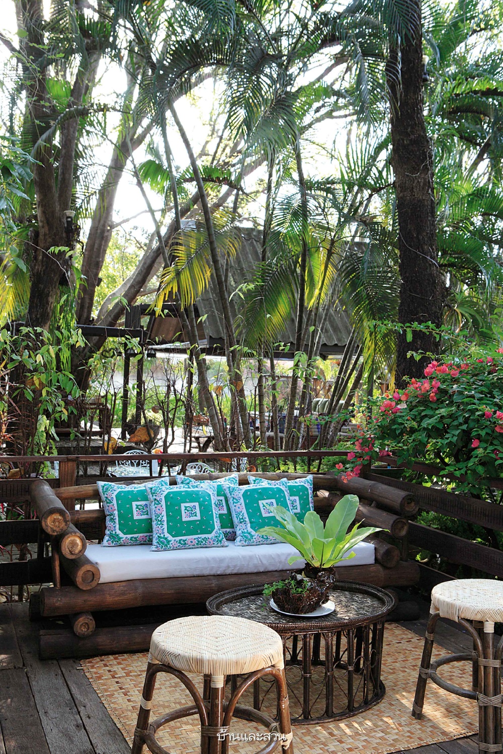 บ้านไม้ชั้นเดียว ที่เลือกใช้โครงสร้างแบบง่ายๆ โดยออกแบบให้เปิดโล่งเปิดรับบรรยากาศสวนแสนร่มรื่น ส่วนการตกแต่งภายในส่วนใหญ่ใช้เฟอร์นิเจอร์ลอยตัว เน้นที่ทำจากไม้และหวาย ซึ่งดูเข้ากับโครงสร้างไม้ของตัวบ้าน