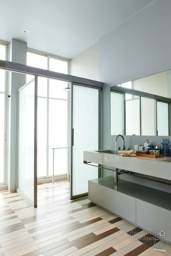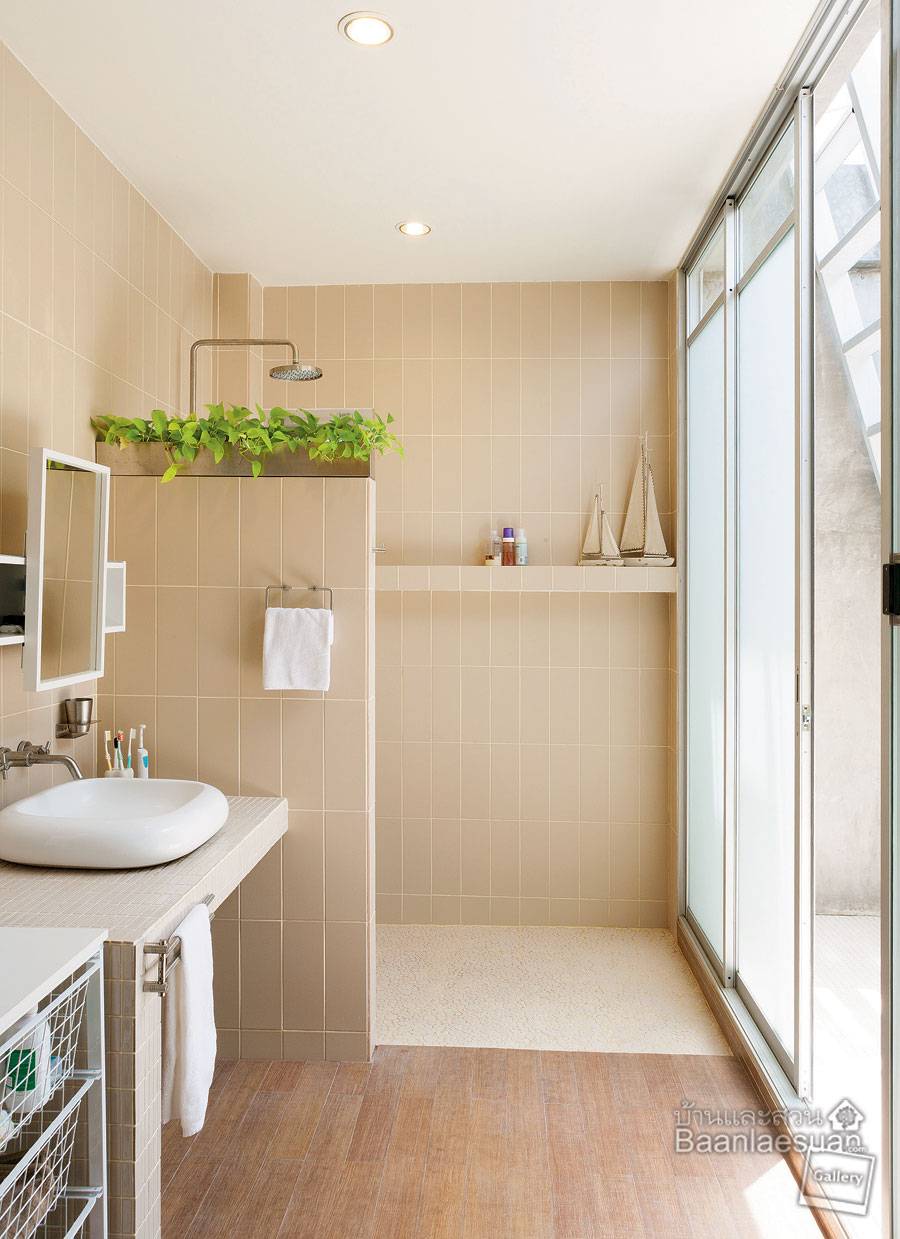 ห้องน้ำในบ้านสำเร็จรูปทั่วไปมักมีพื้นที่ไม่มากนัก ขนาดประมาณ 3 – 4.5 ตารางเมตร แต่ภายในกลับอัดแน่นด้วยส่วนอาบน้ำและโถสุขภัณฑ์ ความจริงแล้วแม้มีพื้นที่เพียงเท่านี้ก็สามารถออกแบบให้น่าใช้งานได้ โดยอาจแยกส่วนอาบน้ำ (ส่วนเปียก) และส่วนอ่างล้างมือ (ส่วนแห้ง) ให้เป็นสัดส่วนมากขึ้น ด้วยการกั้นผนังทึบสูงแค่ระดับศีรษะ (1.60-1.70 เมตร) และกรุกระเบื้องเซรามิกทั่วไป ก็ทำให้ห้องน้ำดูสวยเข้าตาแล้ว แต่ควรคำนึงถึงพื้นของส่วนเปียกซึ่งควรมีระดับต่ำกว่าพื้นห้องประมาณ 5 – 7 เซนติเมตร เพื่อไม่ให้น้ำเอ่อล้นและไหลลามมาถึงส่วนแห้ง