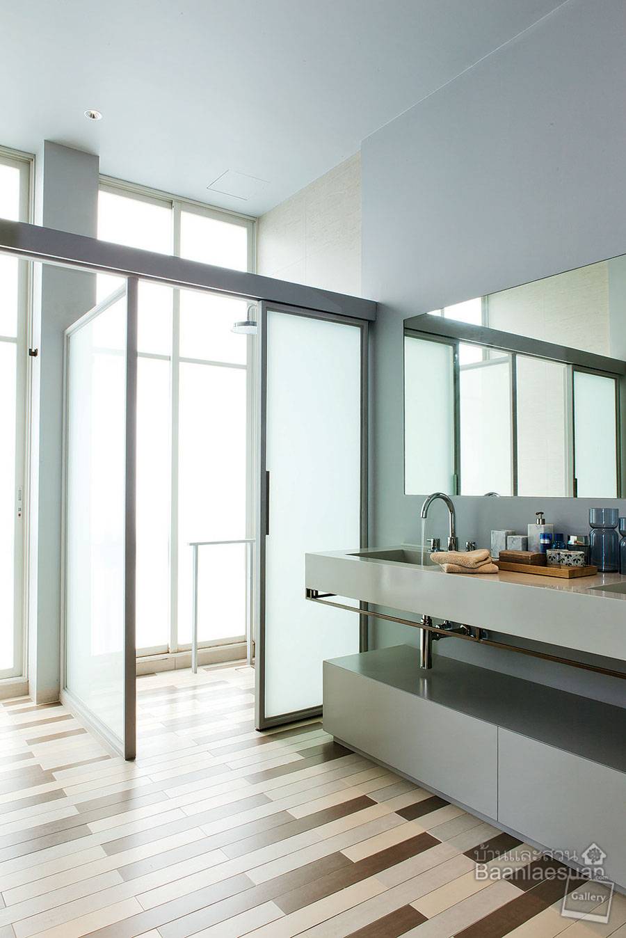 การจัดสวนมุมเล็กๆในห้องน้ำช่วยเปลี่ยนบรรยากาศให้ห้องที่อุดอู้ดูสบายตาและ สบายใจขึ้น อาจออกแบบให้มุมอาบน้ำฝักบัวแบบเรนชาวเวอร์อยู่ใกล้กับสวน ก็จะได้อารมณ์เหมือนอาบน้ำในป่า สำหรับพื้นที่ส่วนแห้งก็วางสุขภัณฑ์และอ่างล้างมือไว้ด้วยกัน ส่วนนี้เลือกใช้วัสดุอย่างหินขัดเทอราซโซเป็นหลัก นอกจากมีพื้นผิวเรียบ ดูสะอาดตาแล้ว ยังทำความสะอาดง่ายด้วย