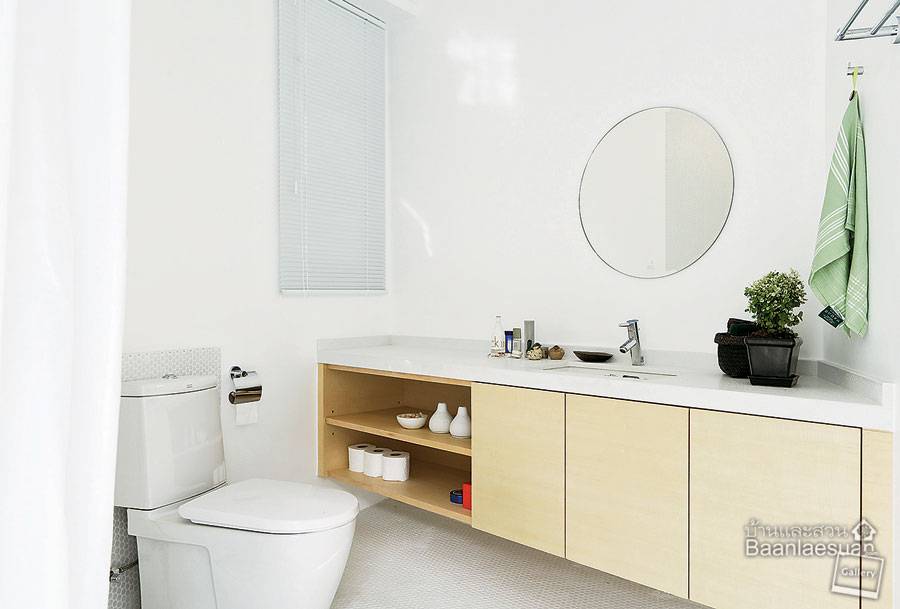 บางครั้งห้องน้ำก็ไม่ได้ออกแบบเป็นห้องทรงสี่เหลี่ยมธรรมดา อาจมีมุมมีซอกที่ทำให้วางสุขภัณฑ์ไม่ลงตัว แก้ปัญหาโดยการวางสุขภัณฑ์ให้ดูเรียบไปกับผนังด้านหนึ่ง สิ่งสำคัญคือการติดตั้งสุขภัณฑ์ควรปรับแนวระดับให้ตรงกับแนวท่อน้ำ เพื่อไม่ให้เกิดปัญหาเรื่องการใช้งานในภายหลัง ภายในห้องเลือกใช้โทนสีอ่อน ช่วยให้รู้สึกไม่อึดอัด ส่วนเคาน์เตอร์อ่างล้างหน้าและตู้เก็บของบิลท์อินให้เต็มแนวผนังอีกด้าน หนึ่ง เพื่อให้มีพื้นที่ใช้งานครบและเก็บของใช้ที่จำเป็นสำหรับหยิบได้ง่ายและใกล้ มือ