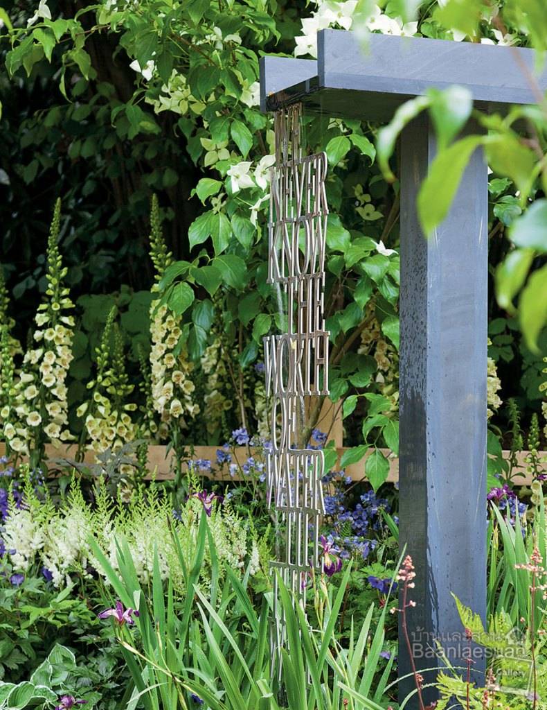 Idea 2 ให้ม่านน้ำเป็นของตกแต่งสวนอีกชิ้น โดยทำเสาซ่อนท่อขึ้นไปยังรางด้านบน แล้วปล่อยให้น้ำไหลลงมาผ่านโลหะที่ฉลุเป็นตัวอักษรซึ่งเรียงร้อยกันเป็นโคลง ภาษาอังกฤษ