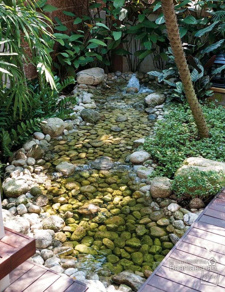 Idea 6 ลำธารตื้นๆที่ออกแบบให้มีน้ำผุดอยู่ด้านหนึ่งสร้างความเคลื่อนไหว ทำเดคไม้บริเวณระเบียงให้หย่อนขาลงไป หรือเดินไปลุยน้ำเล่นในสวนได้โดยไม่ต้องกลัวอันตราย