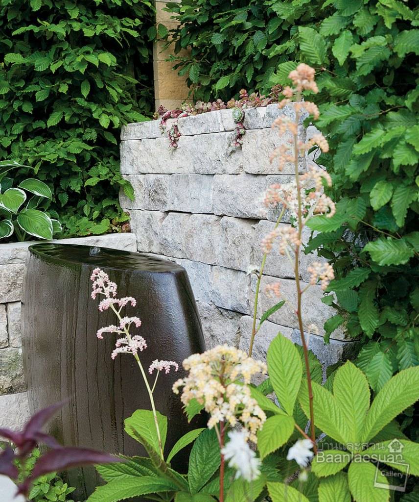 หัวน้ำพุที่ติดตั้งให้แรงดันน้ำต่ำเกิดเป็นน้ำที่ผุดขึ้นจากภาชนะแล้วจึงล้น ลงสู่บ่อด้านล่าง คืออีกไอเดีย จัดสวนน้ำ สำหรับผู้ที่มีพื้นที่ไม่มากนักให้สร้างลูกเล่นน้ำที่ เคลื่อนไหวในสวนได้ อาจติดตั้งไว้ใกล้กับลานนั่งเล่น เชิงบันไดก่อนขึ้นบ้านเป็นจุดต้อนรับ หรือสร้างจุดเด่นในสวนก็ได้