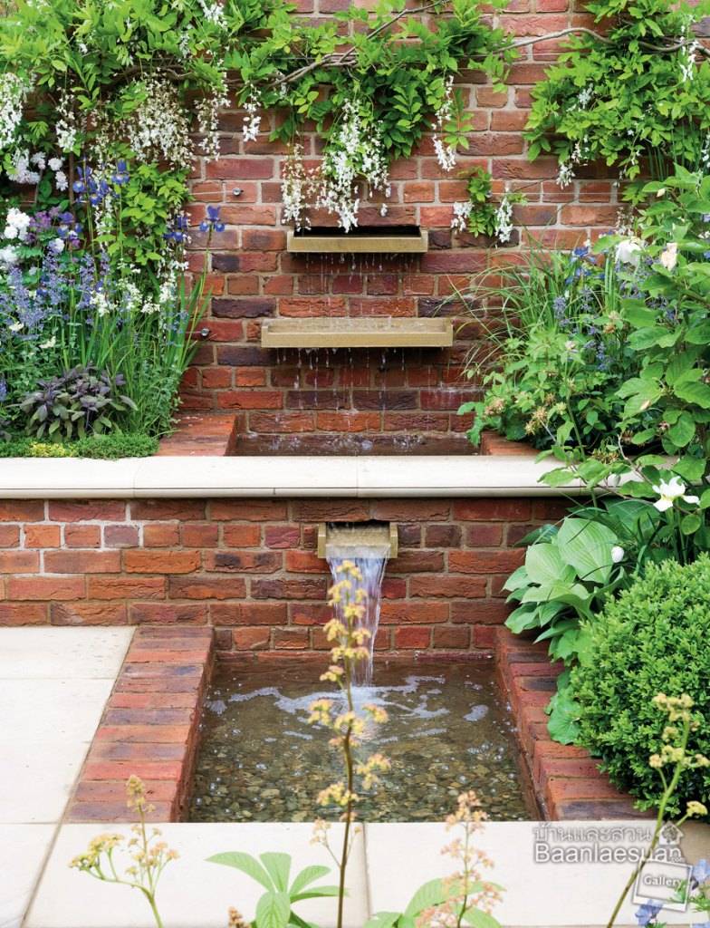 Idea 8 สไตล์อิงลิชคันทรีที่เน้นสีสันและรูปแบบสวนในโทนธรรมชาติ ไอเดียน้ำตกนี้จึงใช้อิฐก่อผนังเว้นช่องน้ำตกเป็นชั้น ๆ ต่อเนื่องจากผนังด้านบนล้นลงสู่บ่อรับน้ำด้านล่าง ออกแบบกระบะต้นไม้เป็นรูปทรงสี่เหลี่ยมรับกันกับบ่อน้ำ แล้วปลูกต้นไม้ผิวสัมผัสละเอียดคละชนิดกัน ส่วนบนกำแพงปลูกไม้เลื้อยขึ้นคลุมจึงดูเป็นธรรมชาติและนุ่มนวล