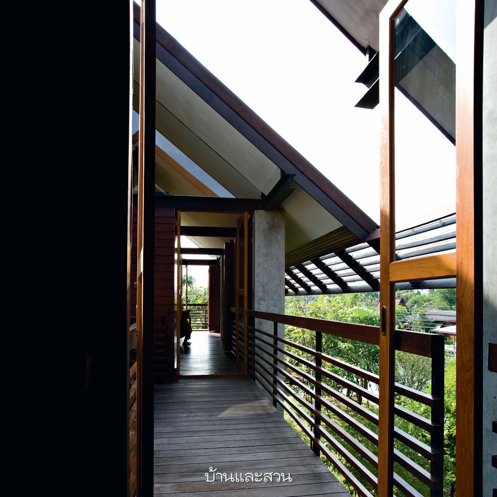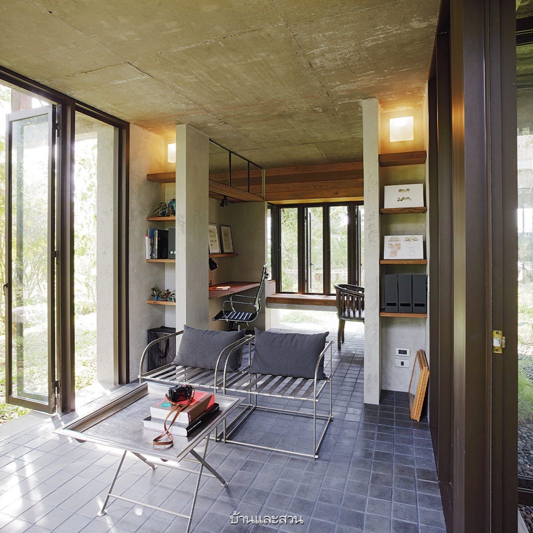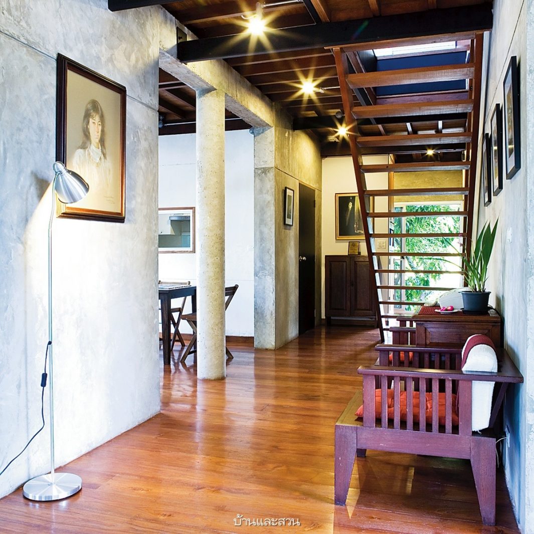 บ้านหลังนี้เริ่มต้นจากความต้องการอยากได้บ้านน่าอยู่สบาย ไม่จำเป็นต้องเปิดเครื่องปรับอากาศตลอดเวลา และมีพื้นที่ใช้สอยเท่าที่จำเป็นต่อการใช้ชีวิตจริงๆ โดยซื้อใช้ไม้จากบ้านเก่ามาทำเป็นโครงสร้างไม้ของบ้านชั้นบน ส่วนผนังทำเป็นปูนผิวขัดมัน เพราะเป็นวัสดุหลักที่เจ้าของบ้านชอบอีกทั้งยังดูแลรักษาง่ายและทนทาน ส่วนที่ขาดไม่ได้คือชานทั้งด้านหน้าและหลังของบ้านที่ใช้งานได้ตลอดวัน เพราะเมื่อเปิดประตูหน้าหลังแล้วจะมีลมที่พัดผ่านโถงกลางบ้านสู่ชานนั่งเล่น ทำให้บ้านไม่ร้อนและระบายความชื้นของส่วนครัวและห้องน้ำได้เป็นอย่างดี >> อ่านต่อ