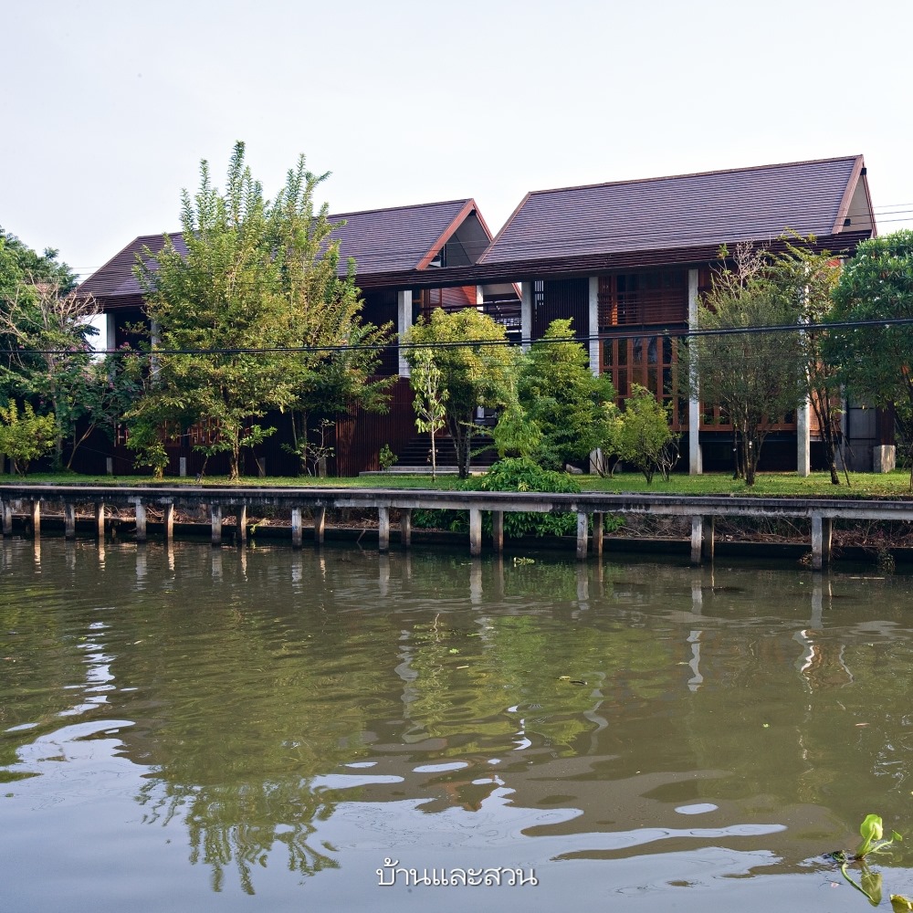 บ้านไม้ริมคลองดำเนินสะดวกในจังหวัดราชบุรีหลังนี้สร้างขึ้นภายใต้แนวคิดบ้านที่มีความเป็นไทยแบบร่วมสมัย ตัวบ้านจึงยกพื้นสูง มีชาน ทำชายคายื่นยาว และผนังไม้ที่มีเส้นสายคล้ายผนังเรือนไทย ส่วนวัสดุหลักนอกจากไม้แล้ว ก็พยายามนำวัสดุสมัยใหม่มาใช้ เช่น ปูน เหล็ก และกระจก นอกจากนี้เจ้าของบ้านยังต้องการสัมผัสธรรมชาติอย่างใกล้ชิด จึงเป็นเหตุผลที่ทำให้บ้านหลังนี้ดูโล่งและเปิดรับทุกสัมผัสจากธรรมชาติ โดยอาจต้องแลกกับความไม่สบายบางอย่าง เช่น การเปิดให้ลมและแสงแดดเข้ามาภายในบ้านได้ ก็อาจต้องแลกกับการมีฝนสาดเข้ามาบ้างเช่นกัน