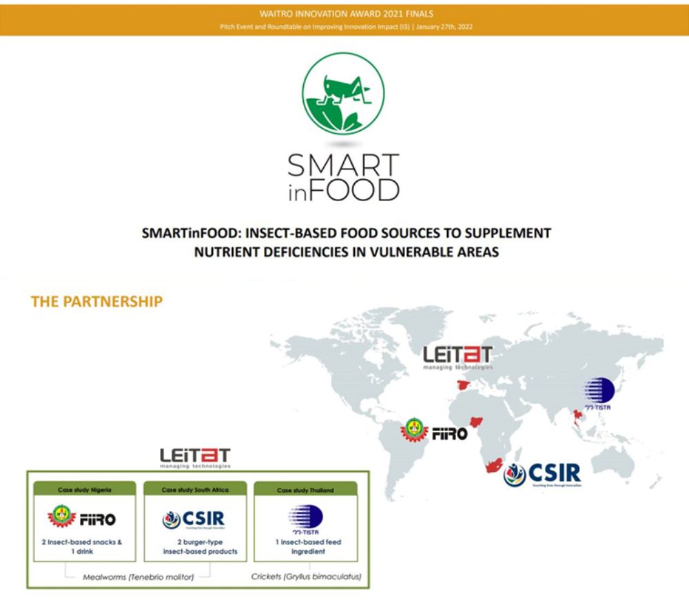 ศ. (วิจัย) ดร.ชุติมา เอี่ยมโชติชวลิต ผู้ว่าการ วว. กล่าวว่า การได้รับรางวัลดังกล่าวของ วว. เป็นผลสำเร็จจากการนำเสนอโครงการวิจัยพัฒนาร่วมกับหน่วยงานสมาชิกใน WAITRO จำนวน 2 โครงการ ได้แก่ 1.โครงการแหล่งอาหารจากแมลงเพื่อเสริมการขาดสารอาหารในพื้นที่เปราะบาง (SMARTinFOOD : Insect-based Food Sources to Supplement Nutrient Deficiencies in Vulnerable Areas) โดยดำเนินโครงการร่วมกับสมาชิกจาก 4 หน่วยงาน ได้แก่ 1) LEITAT ประเทศสเปน 2) วว. ประเทศไทย 3) FIIRO ประเทศไนจีเรีย และ 4.) CSIR ประเทศแอฟริกาใต้ 2.โครงการเสริมสร้างความยั่งยืนของอาหารในเอเชียตะวันออกเฉียงใต้โดยใช้หัวใต้ดินของบุกคนโท (Strengthening Food Sustainability in Southeast Asia by Utilization of Local Tuber of Amorphophallu smuelleri Blume) ดำเนินโครงการร่วมกับสมาชิกจาก BRIN ประเทศอินโดนีเซีย ทั้งนี้ วว. และพันธมิตรที่ร่วมรับรางวัลจะดำเนินโครงการให้สำเร็จเป็นรูปธรรมในระยะเวลาอันใกล้
