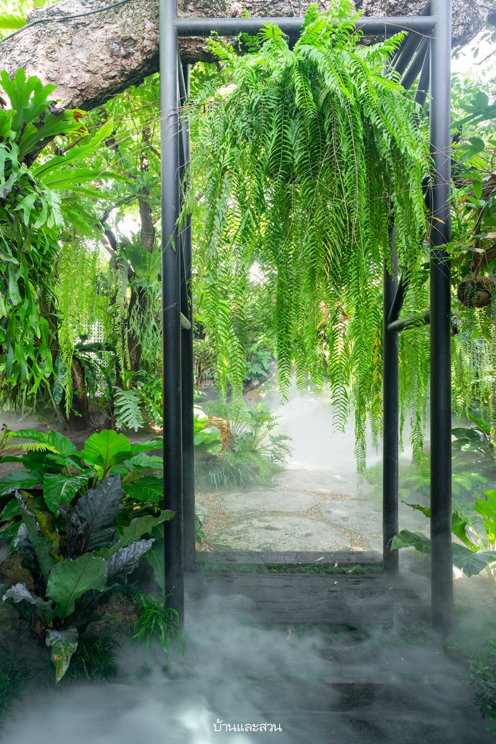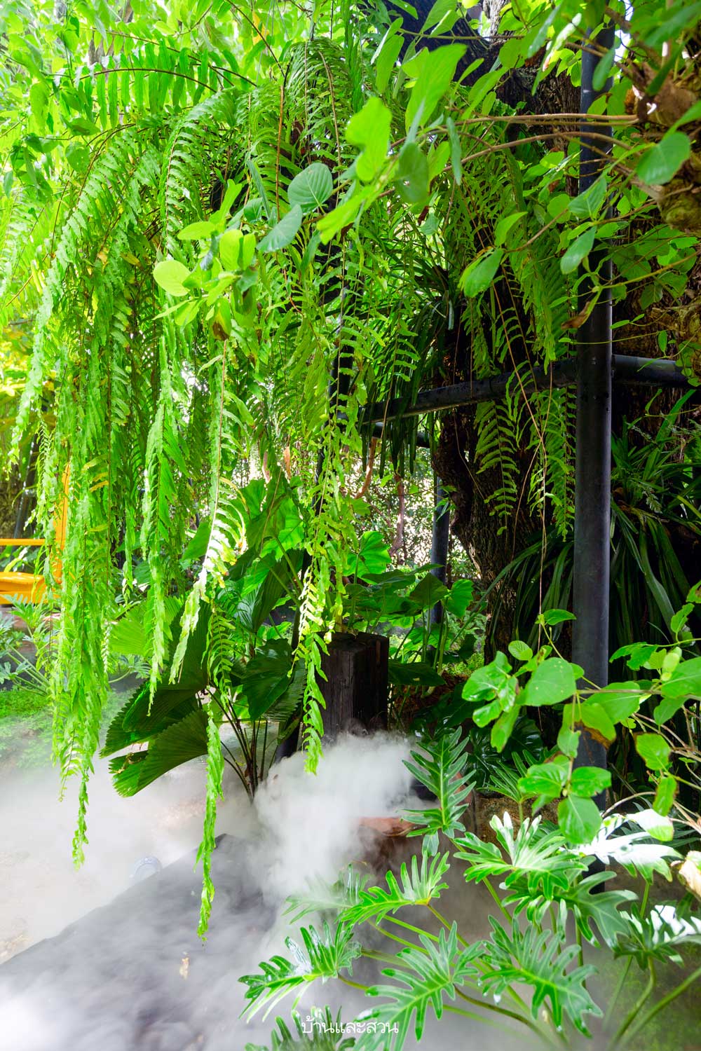 “ผมให้ความสำคัญกับสวนนี้มาก ๆ ครับ เพราะเป็นสวนแรกที่ไม่มีน้ำตกลำธาร ทุกอย่างจะดูเรียบง่าย ดังนั้น ต้องมีอย่างอื่นมาทดแทนไม่ให้รู้สึกด้อยไปกว่าสวนที่มีน้ำตก ผมนำเครื่องพ่นหมอกแบบอัลตราโซนิกมาใช้ที่นี่เป็นที่แรก วางกระจายอยู่ทั่วสวนเน้นบริเวณทางเดินเป็นพิเศษ หมอกที่พ่นออกมาจะอยู่ต่ำระดับผิวดินไหลเรี่ยไปกับพื้น ให้อารมณ์เหมือนลำธาร หรือจะมองเป็นทะเลหมอกก็ได้นะครับ ทำให้เกิดความเคลื่อนไหวในสวน