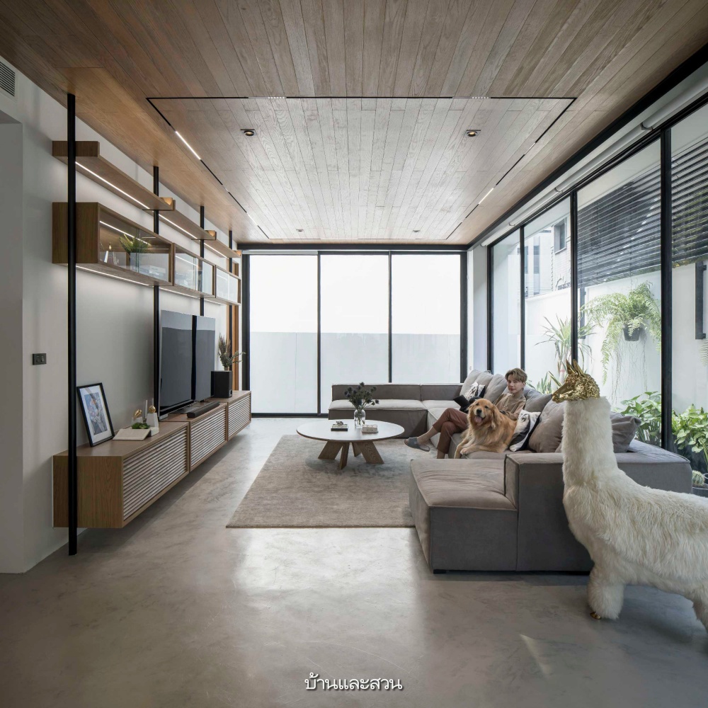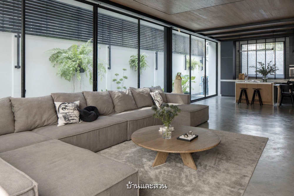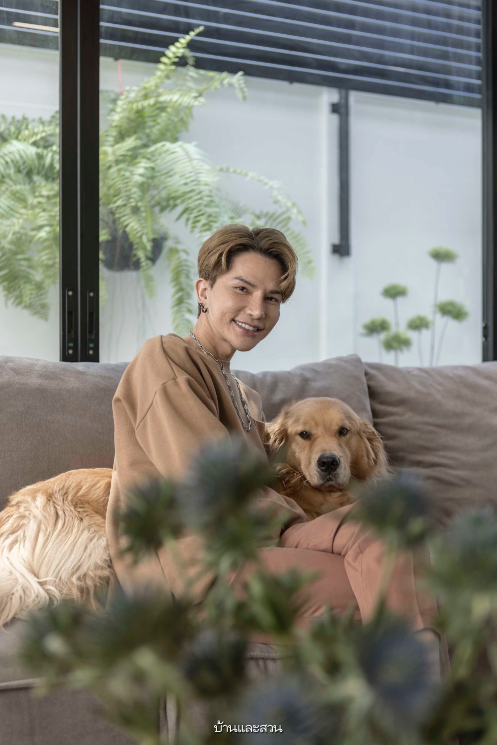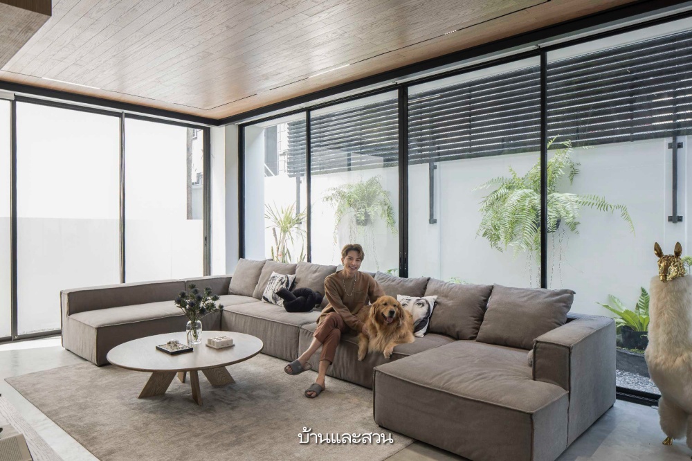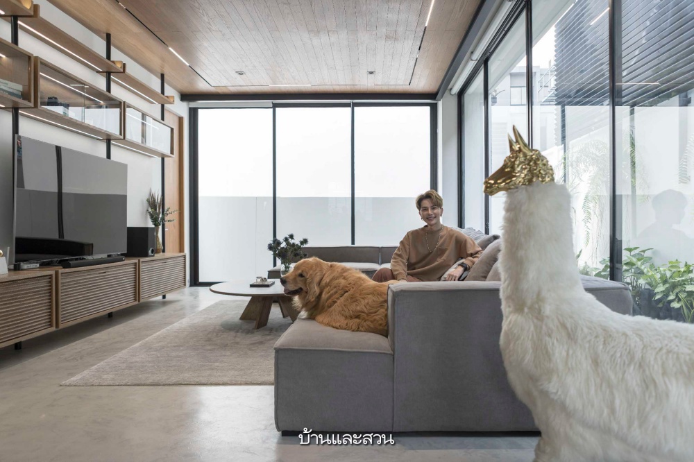 นำมาสู่การทุบผนังบางส่วนออกเพื่อเชื่อมพื้นที่ชั้นหนึ่งให้เป็นผืนเดียวแล้วจัดวางสเปซแบบโอเพ่นแปลนให้ส่วนนั่งเล่นและส่วนรับประทานอาหารสามารถมองเห็นกันได้ตลอดแนว พร้อมเจาะช่องเปิดในฝั่งของเคาน์เตอร์ครัว และกรุกระจกใสตลอดแนวในอีกสองฝั่งเพื่อให้พื้นที่ดูโปร่งโล่ง ที่สำคัญคือการดึงแสงธรรมชาติให้เข้าสู่ภายในให้มากที่สุดเนื่องจากใช้บ้านเป็นหนึ่งในพื้นที่ทำงาน ไม่ว่าจะเป็นการทำงานออนไลน์ งานรีวิว งานรายการ เพราะฉะนั้นทุกมุมของบ้านจึงถูกออกแบบมาให้ถ่ายรูปสวยทุกมุม ตอบโจทย์งานทุกประเภทได้ในพื้นที่เดียว