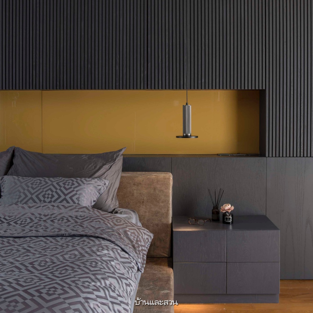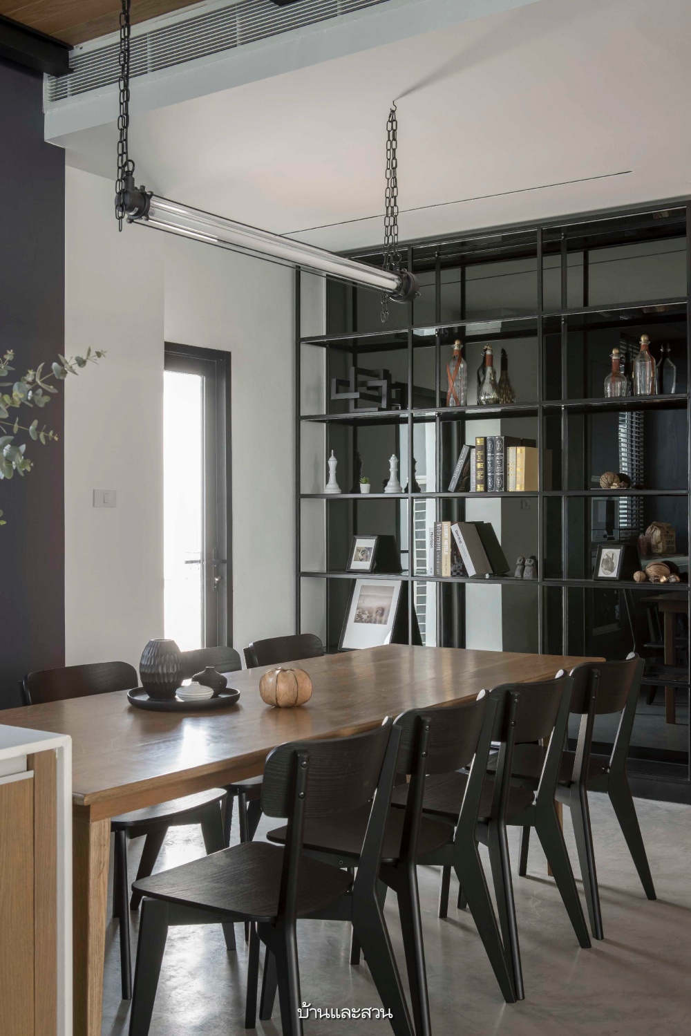 “จากแต่ก่อนที่เราชอบสไตล์ Loft แต่พออายุมากหน่อยรู้สึกว่า Loft มันหนักไปสำหรับเรา อยากได้ความ Minimal ขึ้นมาแต่ก็ไม่ถึงกับ Muji ที่ว่าอยู่แล้วแบบต้องเรียบเป๊ะจนเกินไป เราอยากให้มันดูมีความเป็นธรรมชาติผสมกับความ Loft ได้อยู่” ผลลัพธ์ที่ได้คือการผสานความมินิมัลด้วยวัสดุปิดผิวและบิลด์อินลวดลายไม้ให้ความรู้สึกอบอุ่น เป็นกันเอง แล้วหยอดความเข้มขรึมผ่านเส้นสายสีดำในส่วนของบานกรอบประตู คานตกแต่ง พื้นขัดมัน ชั้นวางของ และเฟอร์นิเจอร์ อย่างลงตัว