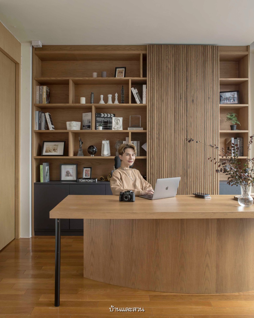 จากโจทย์ที่คุณช่าให้มาว่าบ้านหลังนี้ต้องทำหน้าที่เป็นโฮมออฟฟิศ ซึ่งจากบ้านเดิมห้องนอนอยู่บนทาวน์โฮมชั้นสี่ ทำให้ต้องเดินขึ้น-ลงทุกวันยิ่งวันไหนที่ลืมของเรียกได้ว่าเหนื่อยเป็นสองเท่า พอได้โอกาสทำบ้านใหม่ ห้องนอนและห้องทำงานจึงถูกจัดไว้ในชั้นเดียวกันคือบริเวณชั้นสองห้องติดกัน ทำให้เปิดประตูห้องนอนก็สามารถเชื่อมต่อไปยังห้องทำงานได้เลย