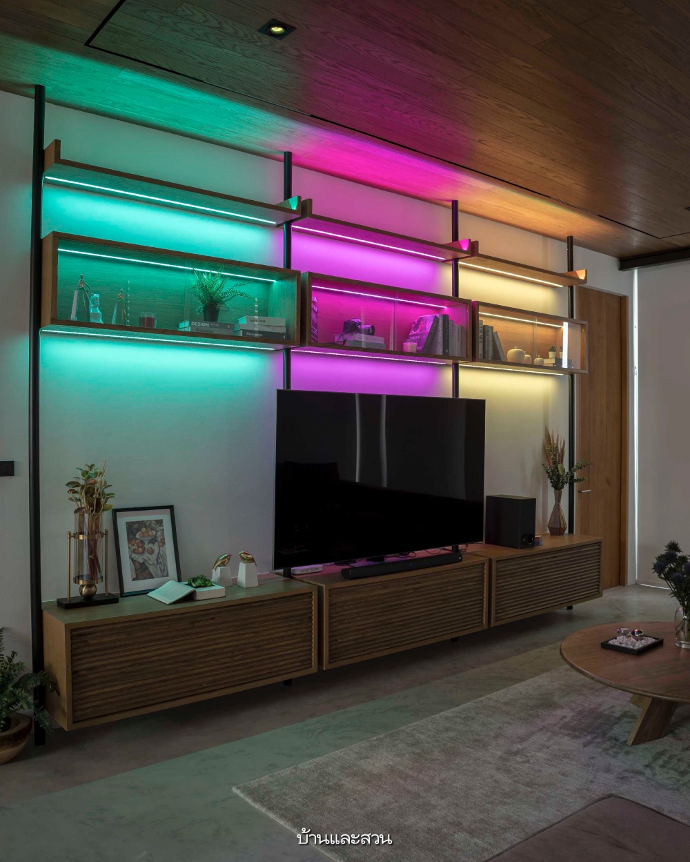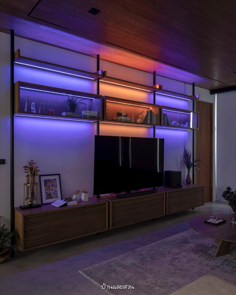อีกหนึ่งไฮไลต์ของบ้านหลังนี้คือการออกแบบแสงสว่าง ซึ่งผู้ออกแบบให้ความสำคัญเป็นอย่างมาก โดยใช้ในบริเวณชั้นวางโทรทัศน์และชั้นวางของบริเวณโต๊ะรับประทานอาหาร ที่สามารถปรับเปลี่ยนแสงสีได้ตามมู้ดแอนด์โทนที่ต้องการ ในวันที่มีปาร์ตี้ หรือ วันที่ต้องการความเงียบสงบ ทั้งยังช่วยเพิ่มมิติให้กับสเปซ สร้างสีสันใหม่ ๆ ให้กับบ้านได้ในทุก ๆ วันแบบไม่ซ้ำ