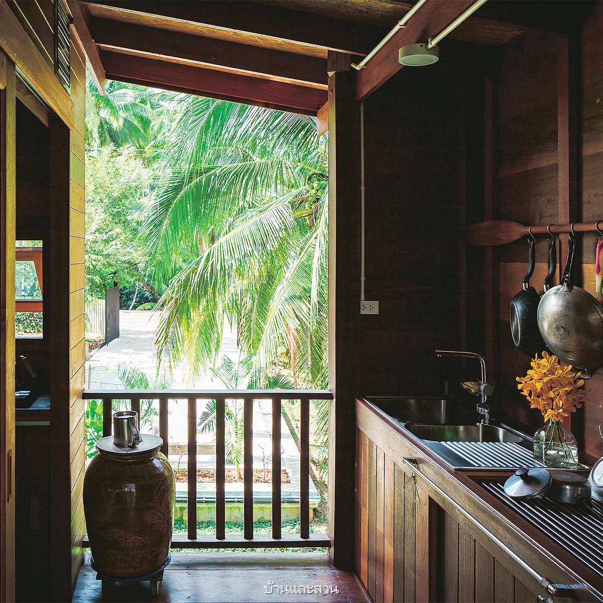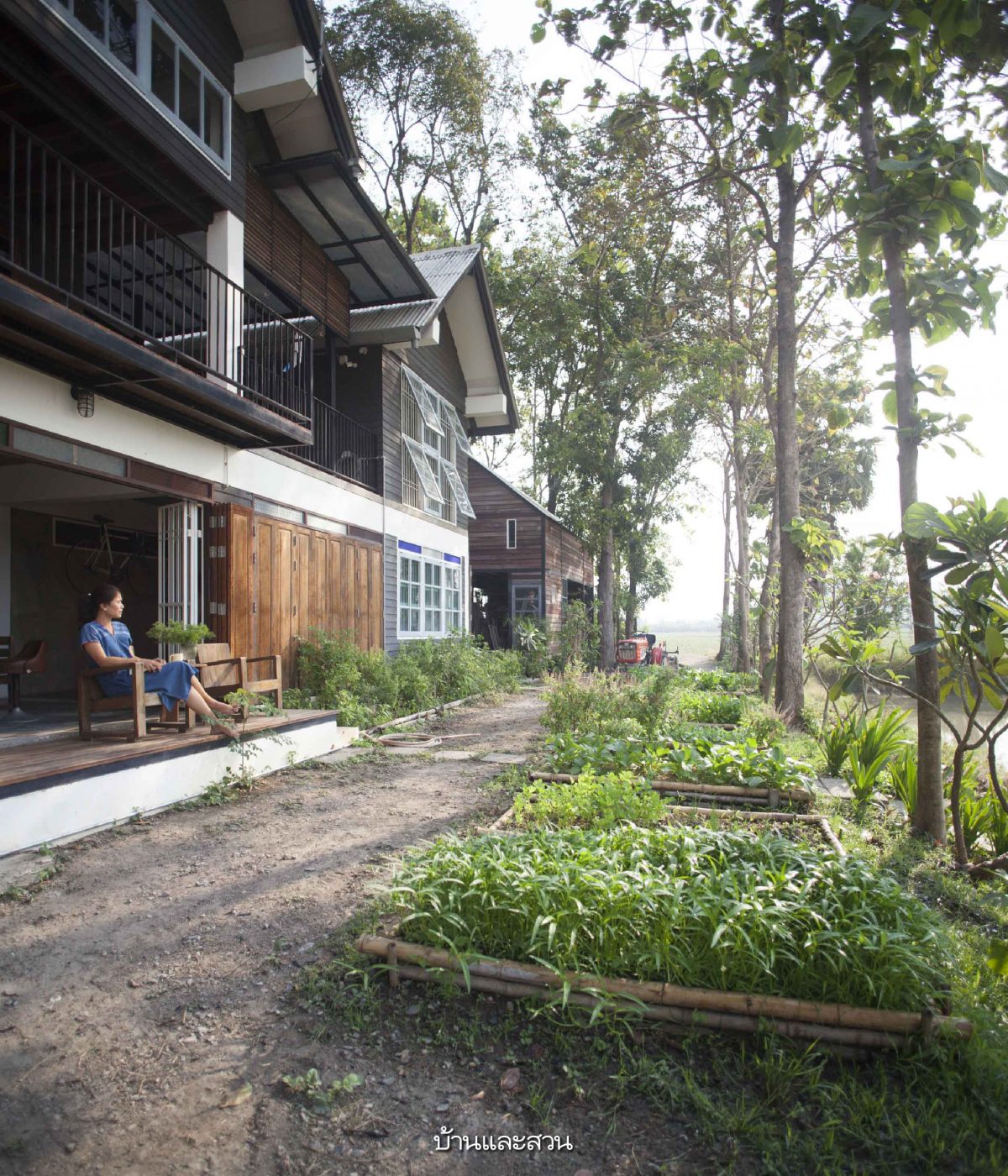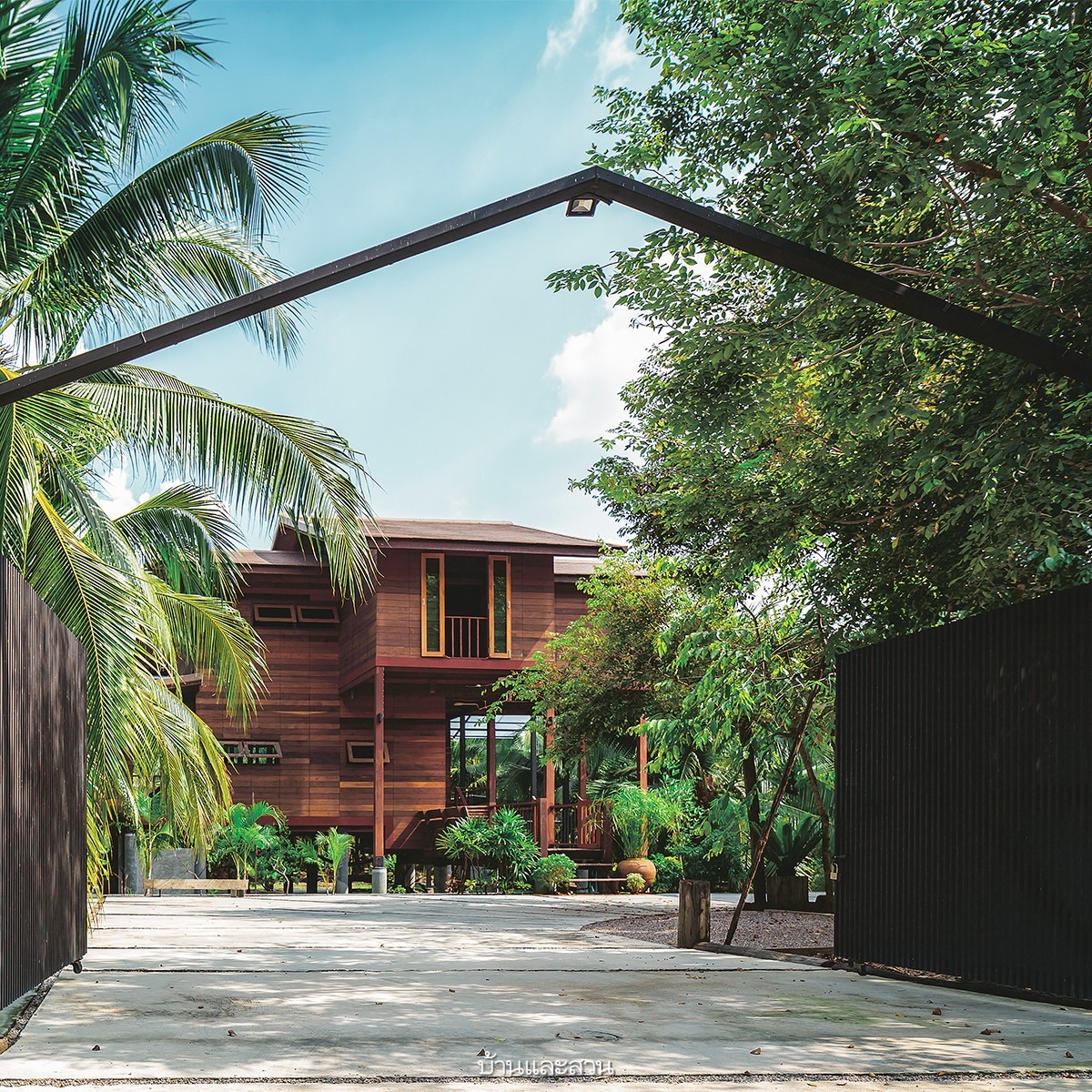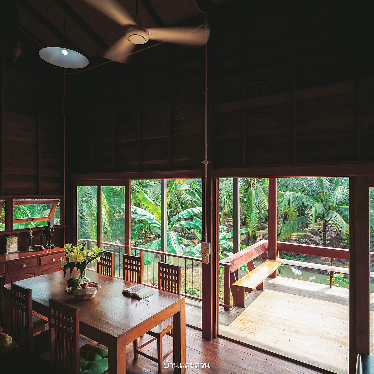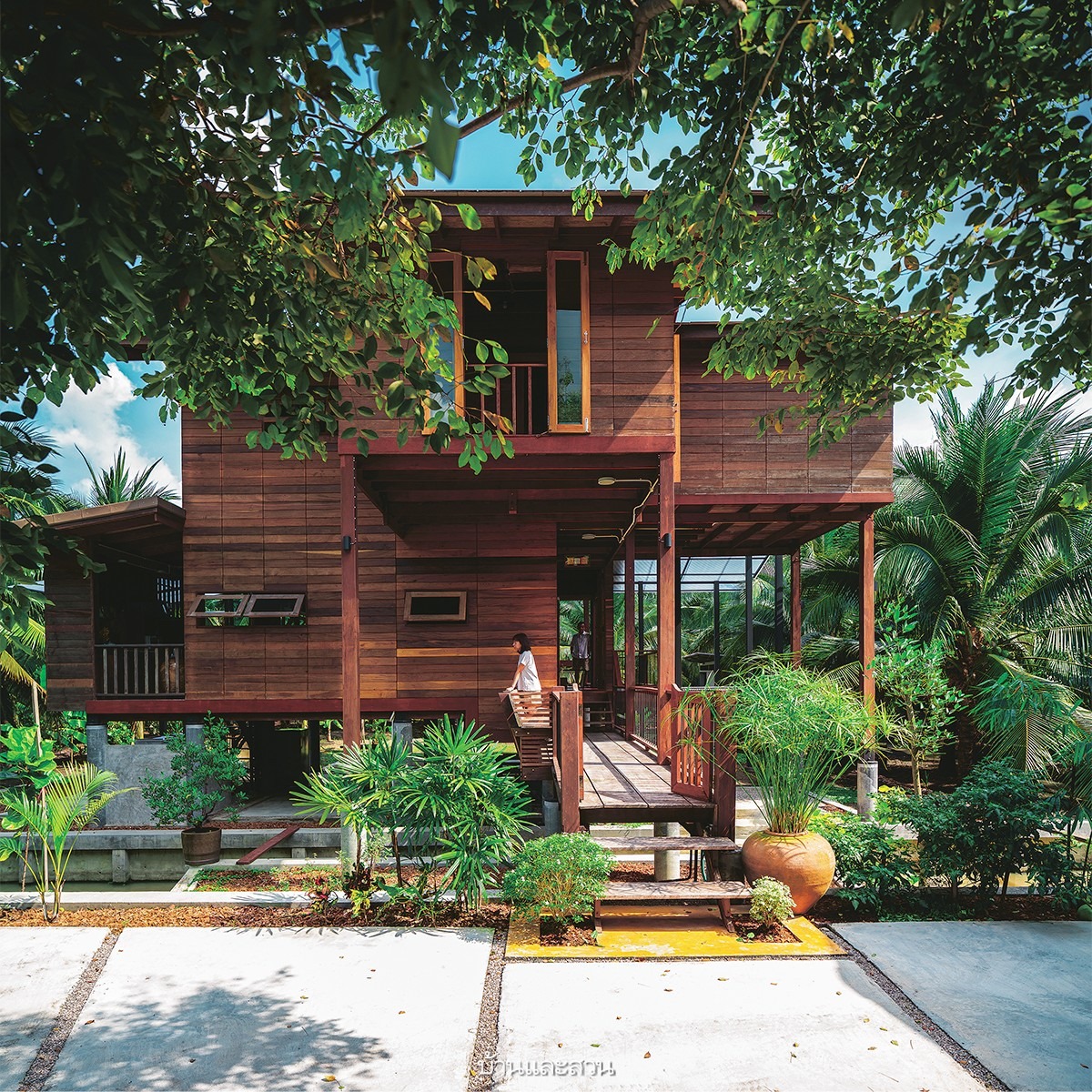 บ้านหลังนี้สร้างขึ้นด้วยแนวคิดการผสมผสานไม้เก่าหลากประเภทเพื่อให้ได้บ้านไม้หลังใหม่ในงบประมาณที่ไม่สูงเกินไป พร้อมอาศัยสภาพแวดล้อมที่ร่มรื่นของสวนผลไม้เก่าในคลองดำเนินสะดวก ซึ่งมีต้นไม้เยอะ มีร่องน้ำ จึงเหมาะกับการเปิดช่องลมและยกใต้ถุนสูงให้ลมพัดผ่าน เพื่อช่วยลดทอนความร้อนของอากาศและทำให้บ้านเย็นสบายโดยไม่ต้องอาศัยเครื่องปรับอากาศเลย >> อ่านต่อ