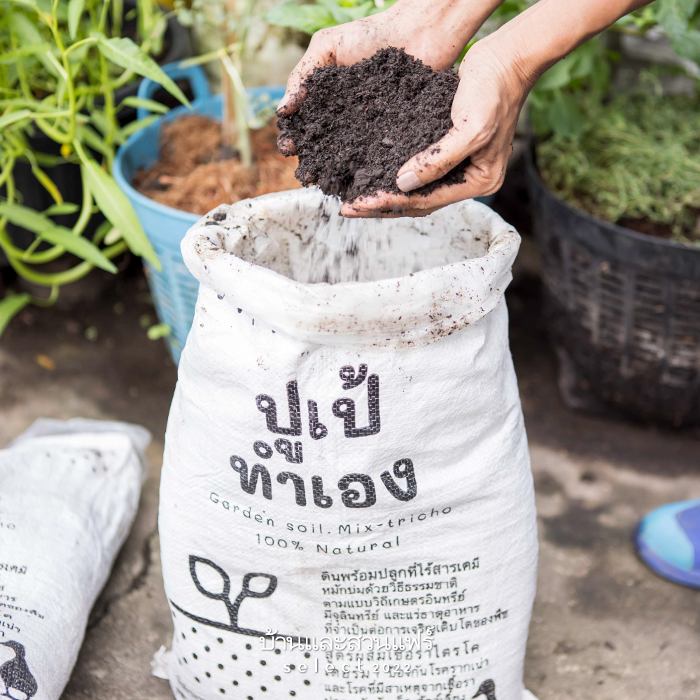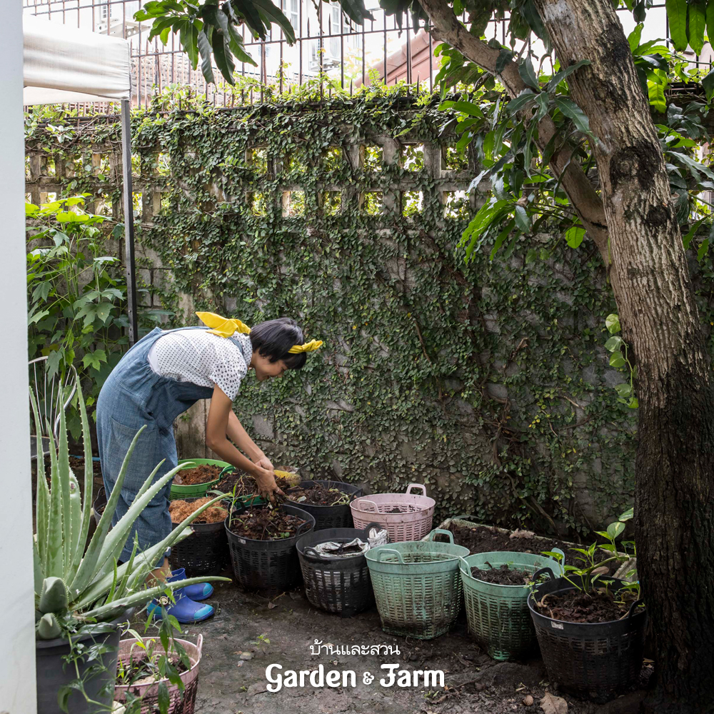 “มันเริ่มจากที่เราเคยใช้ดินที่มีคุณภาพ เป็นดินจากสวนผลไม้นำมาปลูกผักในกระถาง ในดินมีไส้เดือนติดมาด้วยแล้วมันก็ขยายพรวนดินให้ผักเราเติบโต จึงได้รู้ว่าในการปลูกผักดินมีความสำคัญมากๆ แต่ด้วยชีวิตคนเมืองจะหาดินที่มีคุณภาพได้จากที่ไหนนอกจากจะต้องทำเอง จึงเริ่มทำปุ๋ยหมักจากเศษอาหารในเข่งพลาสติก สูตรก็ง่ายๆ สร้างเลเยอร์เป็นชั้นๆ ด้วยใบไม้แห้ง เศษอาหารที่กินเหลือในแต่ละวัน เติมดินในเมืองที่เสื่อมสภาพก็ผสมกลบเข้าไปด้วย หากมีปุ๋ยคอกขี้วัวใส่เป็นชั้นที่ 4 ทำแบบนี้เป็นชั้นๆ ทุกวันรดน้ำให้ชุ่ม เรียกว่าปุ๋ยหมักแบบไม่กลับกอง ทิ้งไว้สัก 3 เดือนก็จะได้ดินปลูกต้นไม้”
